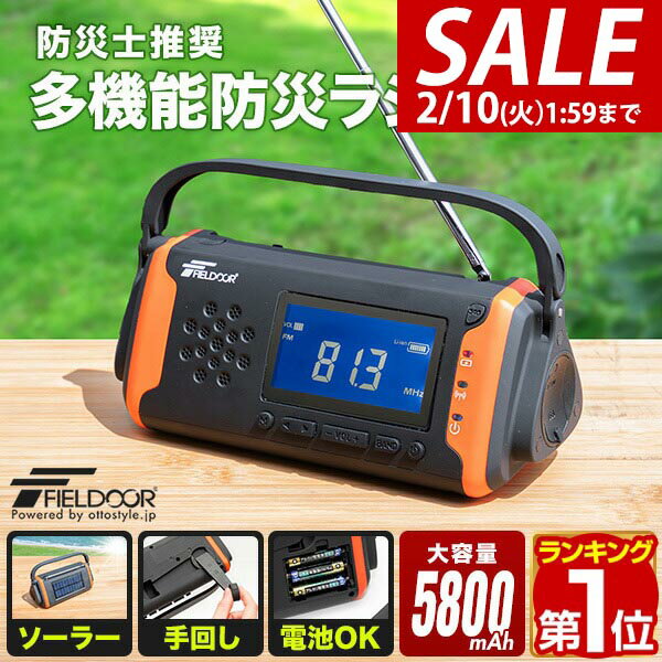 【5,060円→SALE4,840円〜2/10(火)01:59まで】【楽天1位】FIELDOOR 防災ラジオ 多機能 小型 高感度 手回し ソーラー 乾電池 スマホ充電 USB充電 AM/FM ラジオ LEDライト 大容量 5800mAh モバイルバッテリー ソーラー充電 イヤホン 耐機能 ★[送料無料]