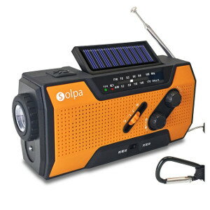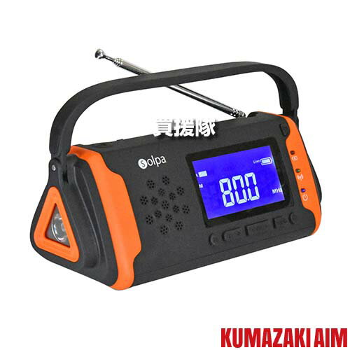 ギフトラッピングについて 商品詳細 メーカー クマザキエイム ブランド Solpa メーカー品番 SL-091 セット内容 本体、USBケーブル、オーディオケーブル、取扱説明書(保証書付) 重量 490g(乾電池含まず) サイズ 幅:202 × 高:80 × 奥:90mm 素材・原材料 ABS、PC、PET 保証 1年間 仕様 電源|内蔵リチウムイオン充電池=3.7V/4000mAh 生産国 中国 定格出力 5V/1A 消費電力(最大) 4W 充電時間(約) USB:6-7時間、ソーラー:45-50時間 ※最大値の直射日光がパネルに満遍なく照射されている状態での合計時間(連続充電時間ではありません)です。、手回し:10-12時間(130-150回転/分)、乾電池:8-10時間(単4形3本) 端子 入力:micro USB(メス)、音声:3.5mmステレオミニ 出力:USB-A(メス) ラジオ受信周波数 AM:522-1620kHz、FM:76-108MHz 懐中電灯 形式:LED、照射効率:1W(30ルーメン相当) 防水等級 IPX-3 色 ブラック × オレンジ ディスプレイ LCD USBケーブル 長さ(約)|450mm、端子|micro USB(メス)、USB-A(メス) オーディオケーブル 長さ(約)|450mm、端子|3.5mmステレオミニ 交換について お客様のご都合による商品の交換はお受けしておりません。返品後、再度ご購入願います。返品については、ご利用ガイド「返品・交換」を必ずご確認の上、お申し込みください。 返品について 開封後はお客様のご都合による返品はお受けできません。返品については、ご利用ガイド「返品・交換」を必ずご確認の上、お申し込みください。 関連キーワード:クマザキ クマザキエイム 防災 防災グッズ 蓄電 充電 手回し 手回しラジオ ラジオ 蓄電ラジオ ソーラー蓄電 ソーラー充電 ソーラー蓄電ラジオ コンパクト スピーカー 懐中電灯 外部音声 アラーム USB充電 乾電池充電いつも使える!もしもに頼れる1台5役 いつも使える!もしもに頼れる!1台5役の蓄電ラジオ 普段使いはもちろん、災害・緊急時の備えとして持ってて安心の「手回し/ソーラー蓄電ラジオ」。 4通りの充電方法により蓄えた電力で、ラジオ放送の受信、スマートフォンの充電や、懐中電灯、SOSアラームと、コンパクトな本体にもしもに頼れる機能が満載。 付属のケーブルを接続してオーディオ機器のスピーカーとしても使用出来ます。 特徴1:AM/FMラジオ 大きくて見やすい液晶表示のデジタルチューナー。ワイドFMにも対応。 本製品が満充電の状態で約18〜20時間動作出来ます。 特徴2:蓄電池 大容量4000mAhのバッテリーを内蔵。iPhone X、Xperia XZ等、電池容量の大きい最新のスマートフォンの充電も安心です。本製品が満充電の状態でスマートフォンを1回充電出来ます。 特徴3:懐中電灯 明るさ1W(30ルーメン相当)のLEDライトを搭載。暗闇でも手元/足元を明るく照らす事が出来ます。本製品が満充電の状態で約18〜20時間動作出来ます。 特徴4:外部音声 音声入力端子を装備。外部オーディオ機器の音声を出力出来るので、スピーカーとしても使用可能。本製品が満充電の状態で約30〜35時間動作出来ます。 特徴5:SOSアラーム 緊急時にボタンを押せば警報音が鳴り、ライトが点滅。周囲に危険を知らせる事が出来ます。 充電方法〜4WAY〜 1:手回し充電 本体底面にあるクランクを回して充電します。毎分130〜150回転させれば、約10〜12時間で満充電になります。 2:ソーラー充電 ソーラーパネルが吸収した太陽光を電力に変換して充電します。約40〜50時間で満充電になります。 ※最大値の直射日光がパネルに満遍なく照射されている状態での合計時間(連続充電時間ではありません)です。 3:USB充電 パソコンやポータブルバッテリー等のUSB端子に接続して充電します。約6〜7時間で満充電になります。 4:乾電池充電 単4形乾電池3本から充電できます。約8〜10時間で満充電になります。