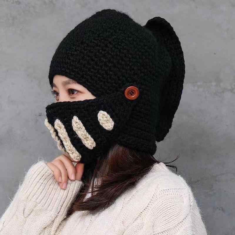 ローマ騎士風ニット帽子 手作りの剣闘士マスク付きキャンプ ウール帽子 秋冬韓国風保温帽 手織りの防寒ハット (ブラック+ホワイト)