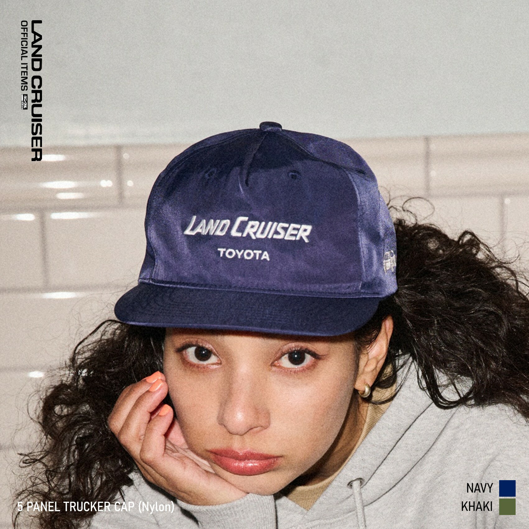 <定番の5パネルトラッカーキャップに、素材違いの新デザインが登場> 定番的な人気のある5パネルトラッカーキャップに、形状は踏襲しつつ、素材を艶のあるナイロンに変更した新バージョンが登場。 夏らしいマリンカラーなネイビーと、無骨な色合いのカーキを新色として追加し、ロゴもクラシックなLAND CRUISERロゴに変更しています。 ランドクルーザーのラフ&タフな世界観を表現するために、キャップとしては一般的なベースボールキャップ型ではなくトラッカーキャップ型で製作。 その特徴は、正面にも縦に生地の縫い目が入る6パネルのベースボールキャップとは異なり、正面に縫い目が入らない一枚布の5パネルから成る形状。 浅めのクラウンでも正面部分にしっかり面が立つため、多くの人にマッチしやすいトラディショナルな作りです。 左側面には、ランドクルーザー70のシルエットの刺繍が入ります。5パネルトラッカーキャップ(ナイロン) Other Color