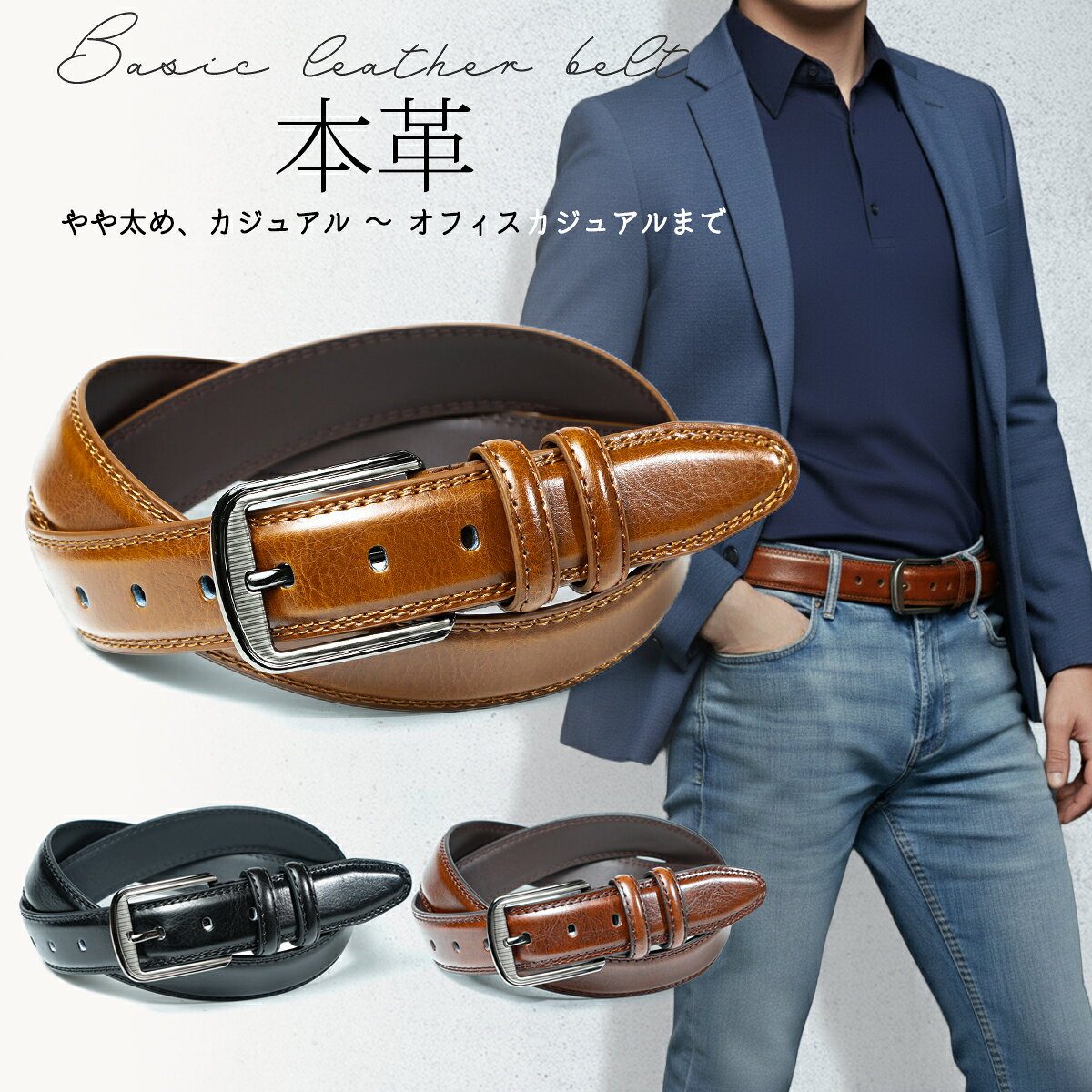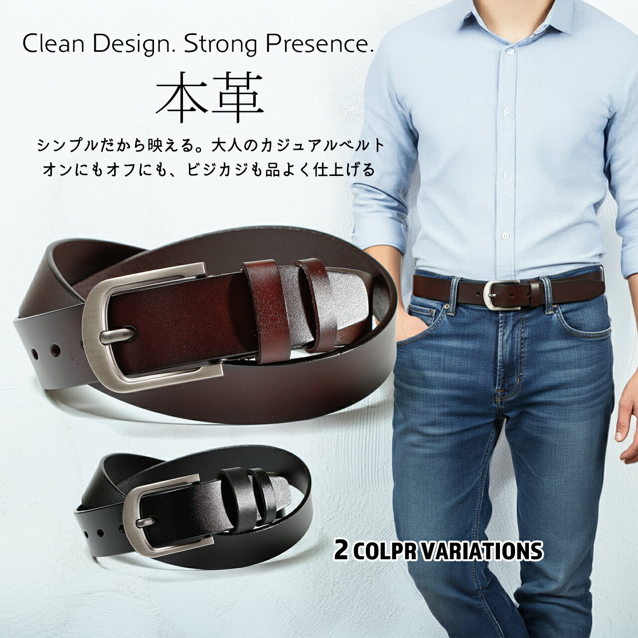 デニムに合う、ちょうどいい太さ。 毎日のカジュアルスタイルに取り入れやすい、落ち着いたデザイン。控えめに光るバックルが、ラフな服装にも大人っぽさをプラスします。 シンプルな本革ベルトだから、デニムにもチノにも合わせやすい。カジュアルでも上品に見せてくれる、頼れる一本。デイリーコーデに自然と溶け込む、大人カジュアル向けの本革ベルトです。 やや太めのカジュアル寄りデザインですが、ジャケパンやオフィスカジュアルには自然に馴染み、堅すぎないビジネスシーンでも活躍します。 長さ :全長約125cm (ピンから最大穴まで約113cm) 幅 :約3.7cm 留穴 :約2.5cm間隔7穴 重さ :約205g 素材 :牛床革 (表面にコーティング層のある革) 付属品 :遊革 (固定されていないベルトループ) 長さの調整は、バックル部のネジを外しハサミで切断後に中央に穴をあけることで行えます。 遊革が付属します。遊革はベルトの先端を押さえるための固定されていないベルトループです。リングを移動して先端のぶら下がりを防止します。不要な場合には取り外してご使用ください。 ※ご使用のモニターの状況により実物と若干色味が異なって見える場合がございます。 ※ポスト投函サイズに畳んでの発送となります。サイズ内で極端な折り曲げを行わずに梱包していますが、若干のシワが生じる可能性があります。使用の過程で消えてゆきますので、商品が届きましたら早めに箱から出して保管しいただきますようお願いいたします。