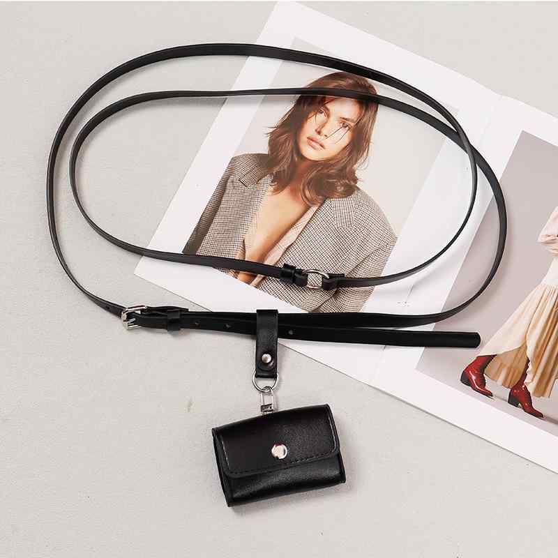 ベルト レディース ブラック PUレザー ウエストポーチ付き 細ベルト スクエアバックル 取り外し可能 調節可能 韓国ファッション インスタ映え おしゃれ 高見え 大人可愛い カジュアル 万能 ファッション小物
