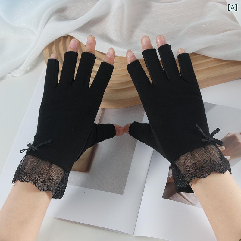 手の甲 ハンドカバー ショート 手袋 グローブ 指穴 レース 薄手 日焼け防止 快適 通気性 耐久性 滑り止め 運転 外出 ギフト おしゃれ レディース リボン 黒 グレー ベージュ 夏