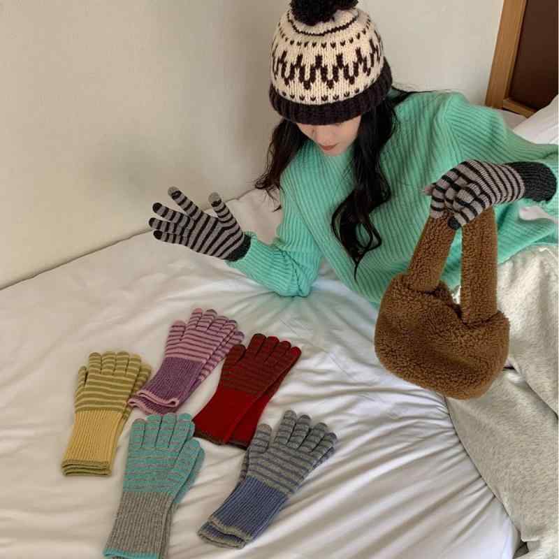 手袋 レディース 秋冬 スマートフォン対応 ウール混紡 ストライプ柄 指なし手袋 ニット グローブ 防寒 暖かい 自転車 バイク 運転 通勤 通学 ブラック 黒 ブラウン パープル イエロー レッド ブルー スカイブルー
