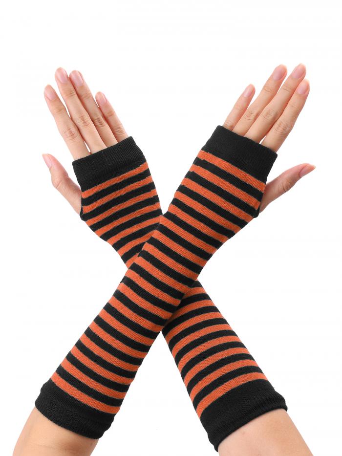 ニット指なし 親指 穴肘の長さ 手袋ウォーマー ストライププリント オレンジブラック 30 x 8 cm