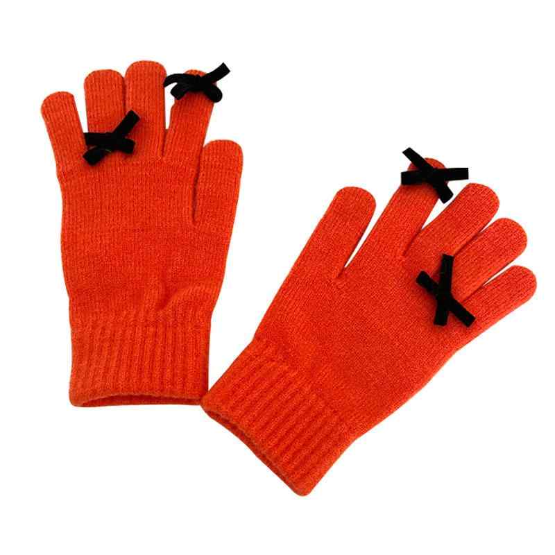 手袋 レディース 大人 冬 暖かい 防寒 保温 厚手 普段使い 外出用 五本指 指抜き かわいい シンプル リボン ピンク オレンジ グレー