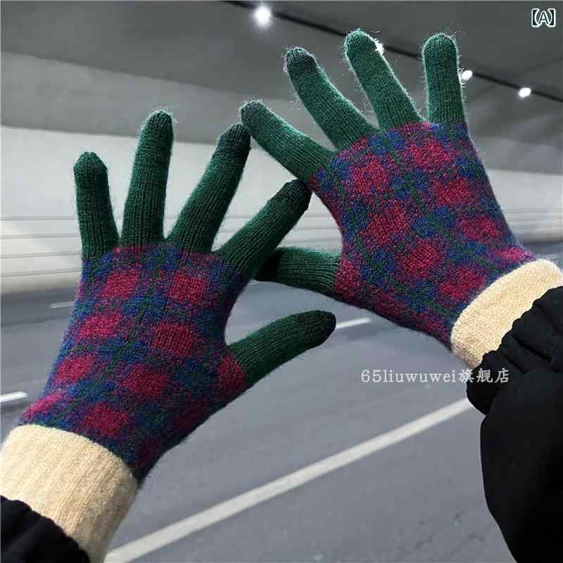 手袋 レディース 秋冬 スマホ対応 ニット 保温 厚手 暖かい 五本指 グローブ 防寒 防風 通学 普段使い お出かけ プレゼント クリスマス おしゃれ シンプル チェック柄 緑 オレンジ 青