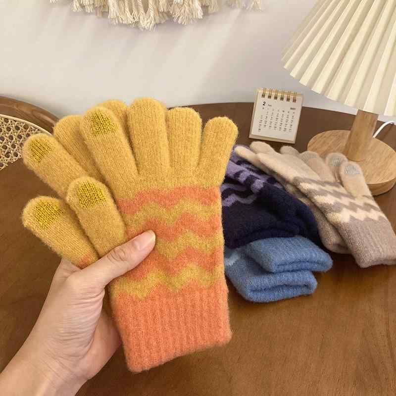 手袋 レディース 暖かい 冬 5本指 ニット 保温 防寒 かわいい フリーサイズ ストライプ バイカラー 通勤 通学 カップル 青 緑 オレンジ