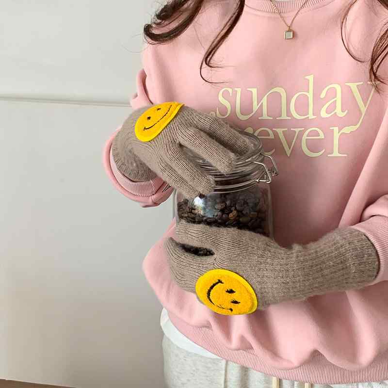 手袋 レディース 秋冬 ニット 手袋 かわいい スマイル パッチ 厚手 保温 ミトン 手首ウォーマー オフホワイト カーキ ピンク イエロー オレンジ レッド グリーン ローズ 青 水色 グレー ブラック