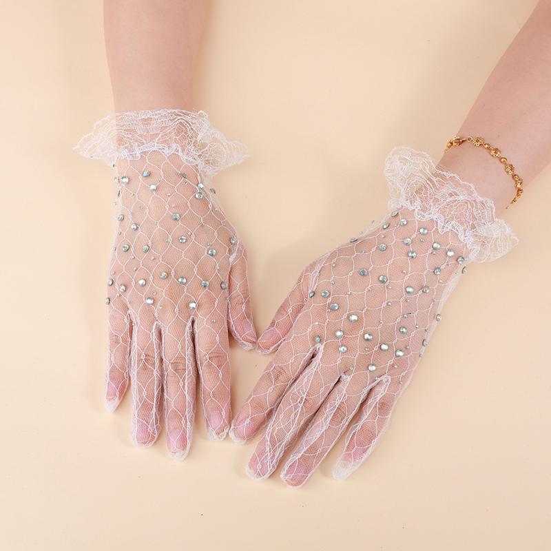 手袋 レディース 春夏 UVカット 接触冷感 薄手 メッシュ レース ラインストーン フルフィンガー 五本指 結婚式 パーティー 発表会 フォーマル ドレス セクシー ホワイト