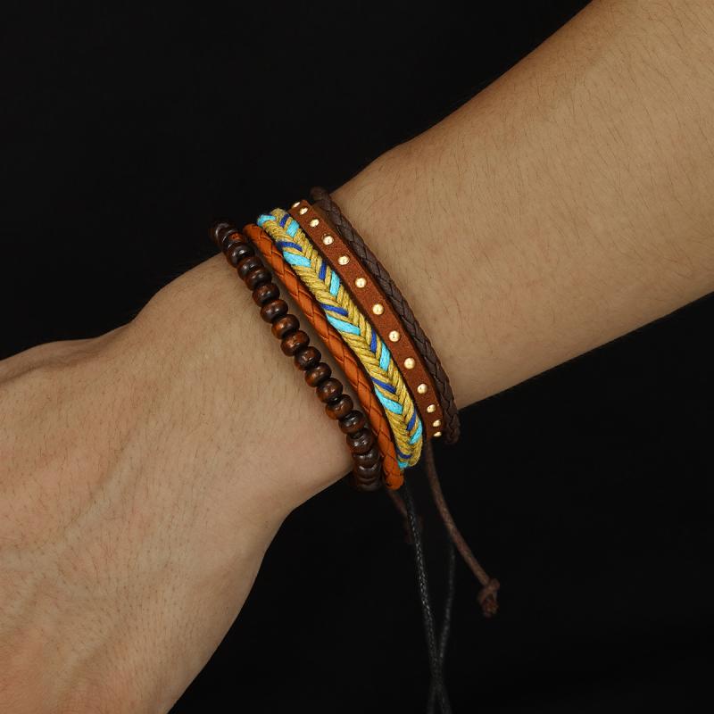 ブレスレット 男性用 メンズ パンク ヒップホップ ロック レトロ ヴィンテージ ストリート 編み込み レザー PUレザー 革 異素材ミックス マルチカラー 3点セット 腕輪 ファッション小物