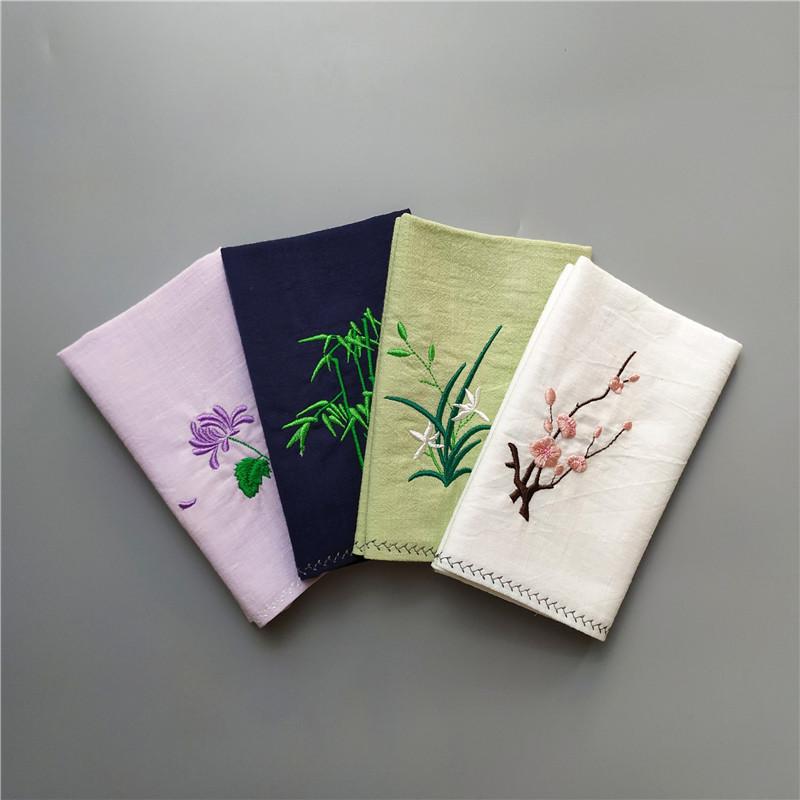 ハンカチ 男女兼用 梅蘭竹菊柄 刺繍 古風 和モダン 綿麻 吸湿速乾 薄手 上品 スクエアタオル 普段使い 肌触り良い