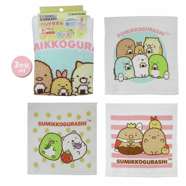 6575038300 ハンドタオル 3枚組 すみっコぐらし たべもの王国 San-x サンエックス 入園 入学 グッズ 準備 保育園 幼稚園 小学校 女の子 ガールズ タオル 綿 洗顔 手洗い エチケット キャラクター 丸眞 携帯 トイレ 洗面所