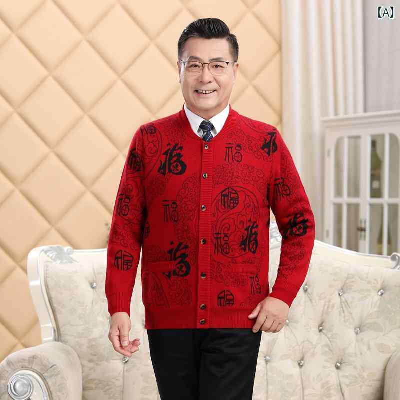 カーディガン レディース 秋冬 メンズ シニア カップル 厚手 暖かい 裏起毛 ウール ニット 長袖 ラウンド Vネック ボタン ポケット レトロ チャイナ風 福字 赤 大きいサイズ プレゼント