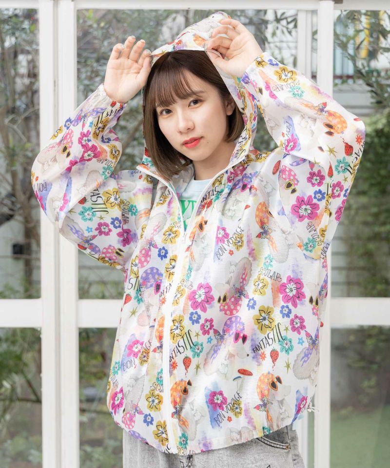 スカラー SCOLAR ワンちゃん アート花柄 2柄展開 シアーパーカー オフホワイト ピンク M アウター ポリエステル 光沢 カラフル 総柄 羽織 長袖 ドローストリング 軽い おしゃれ かわいい 春 夏 カジュアル