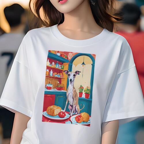 ウィペット Tシャツ レディース 犬ファン 半袖 春夏 犬柄 プリント カジュアル かわいい 人間用 個性派 ここだけのデザイン 面白 ティーポット ウィペット 焼き菓子 窓 食器棚