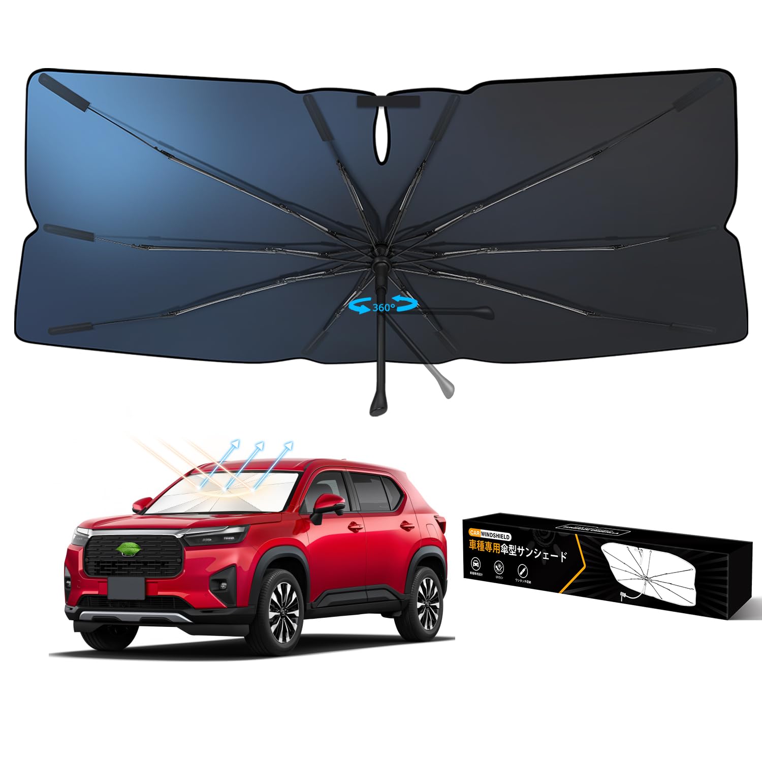 【SS期間限定15%オフ】トヨタ カローラ クロス 10系 傘型 専用フロントサンシェード 10本骨 ガラス繊維 360°回転可能 傘柄が曲がる パラソル 専用設計 UVカット 日焼け防止 劣化防止 収納バッグで 簡単に取り付け (2021年9月-現行)
