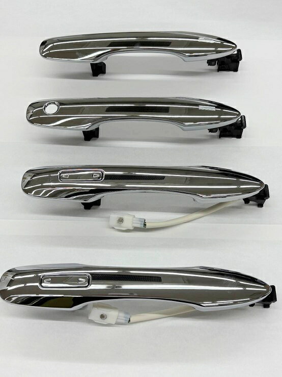 ヴェルファイア、40系装着用のメッキドアハンドル1台分です。 非装着グレードに交換装着することで高級感のあるサイドビューに変わります。 貼付式のメッキカバーとは違い交換式なので、厚みや段差、スマートスイッチ部の違和感もなく、 メーカー付と同様に綺麗に仕上がります。 トヨタ純正部品なので安心の品質です。 ※フロント左右スマートキー対応(運転席・助手席) ※スライドドア左右パワースライドドアスイッチ付き 元のドアハンドルと同一の装着方法です。(取付要領書等は付属しません。) ※この商品は代引き非対応です。