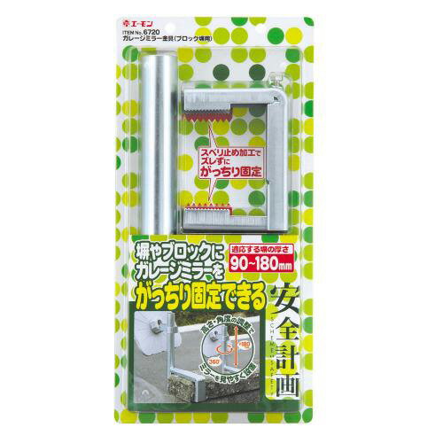 ■塀やブロックにガレージミラーをがっちり固定できる ■スベリ止め加工でズレずにがっちり固定 ■対応する塀の厚さ90mm~180mm ※本製品はITEM No.6600・6601・6602・6603・6604・6605・6610・6611・6710・6716・6717 ガレージミラー専用です 【仕様】 ・挟み込み金具:横130mm 縦90mm ・ポール:直径32mm 全長300mm ・ミラー取り付け金具:全長105mm ・ボルト:M6×40mm/M6×16mm ・平ワッシャー:M6 ・スプリングワッシャー:M6 ・ナット:M6 【内容物】 ・挟み込み金具:1セット ・ポール:1個 ・ミラー取り付け金具:1セット ・ボルト:3個 ・平ワッシャー:3個 ・スプリングワッシャー:3個 ・ナット:1個■メーカー名:エーモン工業■メーカー品番:6720