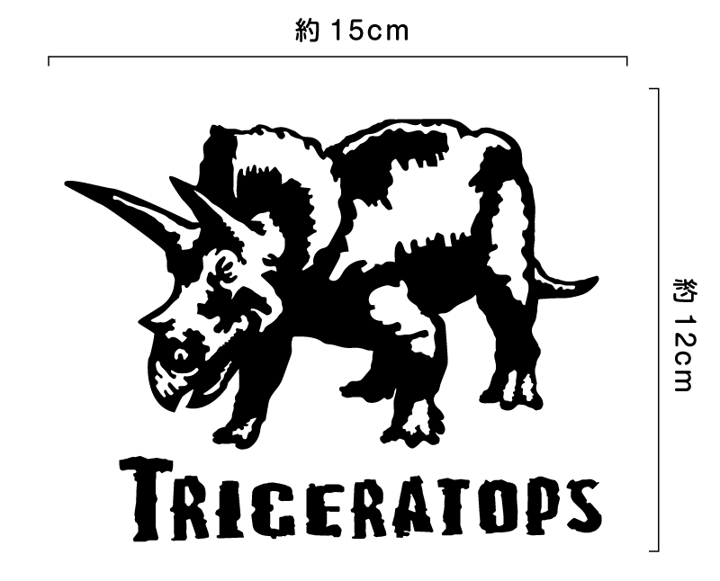 【商品説明】 絵柄だけが転写されるカッティングステッカーです。余白がないのですっきりとスタイリッシュに仕上がります。車やバイク、ヘルメット、スノーボード、サーフボード、スケートボード、スーツケース、のドレスアップステッカーとして。また、傷隠し、リペアステッカーとしても便利にご利用ください。 当店では、白、黒、赤のカラーは住友3Mカッティング用シートを使用。他のカラーも実績のある国内メーカーリンテック株式会社製のフィルム材を使用。屋外での長期耐光性、防水性に優れ自動車のボディやボンネット、ガラス、露天のサイン等にも使用されています。 このステッカーは貼りつけた後、時間の経過とともに密着力が増してゆきますが、貼り付け直後は使用している糊の性質上、密着が弱い場合があります。そのような場合は指などで温めるように押し付けて密着を安定させてください。また、貼り付け対象物が汚れていたり、冷えていたり(5℃以下)すると貼りつかない場合があります(貼り付かない物に関しては下記説明をご参考にしてみてください)事前のクリーニングや適温下での貼り付けをおすすめ致します。 上質なシール材を使用しておりますので、適切な貼り付けにより、しっかりとした粘着が得られます。 〈材質耐性試験〉【耐熱】80℃168時間異常無し 【耐水】23℃168時間異常無し 当店商品ページの貼り方動画もぜひ参考にしてみてください! サイズ:15cm×12cm人気の恐竜トリケラトプスのカッティングステッカーです! トリケラトプスは白亜紀(約1億4500万年前〜6600万年前)の地球に生息していた大型の草食恐竜です。 大きな体と三本の角が生えた特徴的な姿から草食恐竜の中でも最も有名な種のひとつとして知られています。 トリケラトプスの名前には「三本角の頭」という意味があり、トリは数字の3を表し、ケラトは角、プスは顔を意味します。 トリケラトプスの三本の角に由来したわかりやすい名前だといえます。 体長は9メートルを超え、体重は8.5トンにまで成長しました。 天敵とされていたティラノサウルスと比べその体重は1.5倍ほど重くなります。 大型の肉食恐竜たちにとってトリケラトプスは捕獲すれば最上の食料となったはずですが、この体格差を考えると狩り は一筋縄ではいかなかったはずです。 肉食恐竜たちにとってトリケラトプスの狩りは命懸けの戦いだったに違いありません。