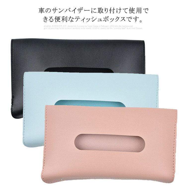 車のサンバイザーに取り付けて使用できる便利なティッシュボックスです。車載だけなくお部屋のインテリアとしてももちろんご使用いただけます。普通車・軽自動車など車種を問わず、ご使用可能です。サンバイザー以外でもクリップが挟める所であればどこでも使用可能です。クリップがしっかりと挟んでくれるので落下の心配もありません。ボタンを外すだけでティッシュの補充も簡単にできます。便利なティッシュボックスで快適なドライブをお楽しみください。 サイズフリーサイズサイズについての説明23*13*2CM素材レザー色ブラック ブルー ピンク備考 ●サイズ詳細等の測り方はスタッフ間で統一、徹底はしておりますが、実寸は商品によって若干の誤差(1cm〜3cm )がある場合がございますので、予めご了承ください。 ●商品の色は、撮影時の光や、お客様のモニターの色具合などにより、実際の商品と異なる場合がございます。あらかじめ、ご了承ください。●製品によっては、生地の特性上、洗濯時に縮む場合がございますので洗濯時はご注意下さいませ。▼色味の強い製品によっては他の衣類などに色移りする場合もございますので、速やかに(脱水、乾燥等)するようにお願いいたします。 ▼生地によっては摩擦や汗、雨などで濡れた時は、他の製品に移染する恐れがございますので、着用の際はご注意下さい。▼生地の特性上、やや匂いが強く感じられるものもございます。数日のご使用や陰干しなどで気になる匂いはほとんど感じられなくなります。