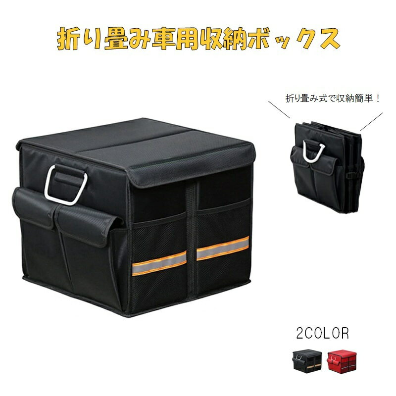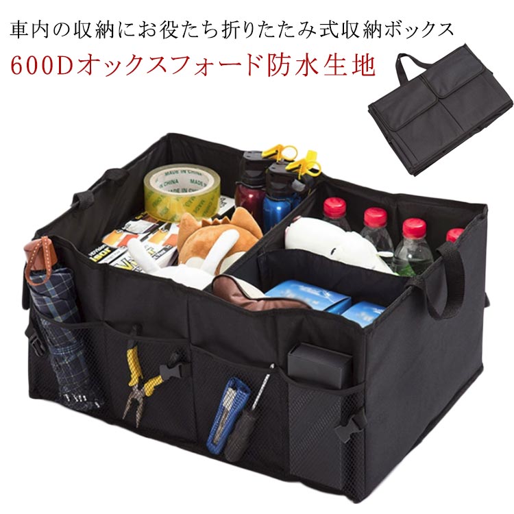 \P10倍+10%OFFクーポン/【折りたたみ式&軽量300g】車用収納ボックス 大容量 メッシュポケット付き 仕切り付き トランク収納バッグ コンパクト 車内 整理グッズ 軽自動車 SUV対応 工具 洗車道具 アウトドア用品 防災バッグ 黒ベース ドライブ レジャー 小物収納