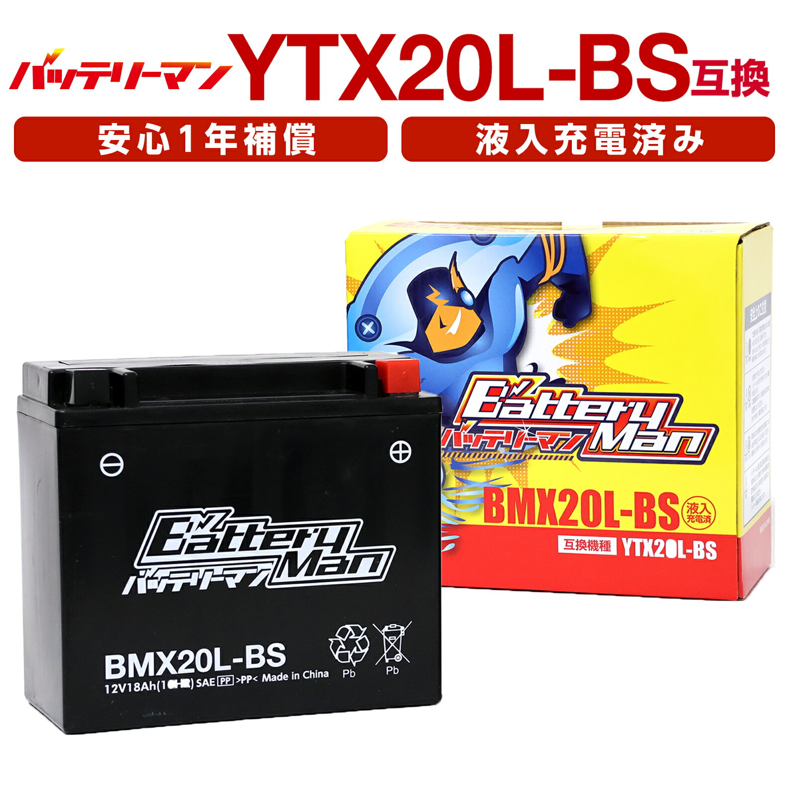 ※商品の参考画像です。実物とは異なる場合があります。 カラー、サイズ等は商品説明欄をご確認ください。 商品名:BMX20L-BS(YTX20L-BS 互換)(液入充電済) ブランド:バッテリーマン バッテリーマンは、低価格・高品質を実現した様々なシチュエーションでお手軽にお使いいただけるバッテリーです。大規模グローバル工場で生産する高性能とコンテナ単位での大量生産による輸送コスト削減で低価格で驚きのコストパフォーマンスを実現させました! 弊社品番:013010024 JANコード:4562338934311 特長:液入り充電済みなので、購入後すぐに使用出来ます。発送日より1年の保証期間内に製造上の不具合によりバッテリーが使用不能となった場合代替品と交換または商品代金をご返金致します。 仕様:10時間率 容量(Ah):18 商品サイズ:長さ:175×幅:87×高さ:155mm 単位:1個 タイプ:液入MFタイプ 適合車種:GL1800ゴールドウイング|VTX1800|ロイヤルスター1300|XV1600ロードスター ※車名が同じ場合でも、車種によっては年式やタイプにより搭載バッテリーが異なる場合がありますので、必ず実際に搭載されているバッテリー形式をご確認下さい。 ※ハーレーには適合しません。ハーレー車の場合はプロセレクトバッテリーのPSB052(液入りタイプ)はお勧めです。 ※注意:※バッテリー1年保証内容 ・保証期間は当社発送日を持って保証開始日とさせていただきます ・保証に関するお問い合わせは、お電話またはメールにてご連絡ください ・ご連絡を頂きましたら速やかに交換品出荷手配を行います ・交換品は保証期間内で2回までと致します ※保証期間中でも以下の場合は保証対象外となる場合がございます。 ・横置き(斜め置き)車両に液別をご使用の場合。(液入り充電済みは除く) ・保証書の添付がない場合 ・必要事項が未記入場合。 ・店名が押印されていない場合。 ・車両に適合していないバッテリーをご使用の場合 ・二輪自動車以外の用途にご使用の場合 ・横置きタイプの車両には、液入りタイプバッテリーのご使用をお願いします。 ※一部の車両で取り付け出来ない、もしくはカバーなどの加工が必要な物、取付けベルトが付きにくい場合がございます。 ※パッケージは予告なく変更する場合がございます。 ※画像と異なる場合がございますので、予めご了承ください。 備考:互換品番:YTX20L-BS、PTX20L-BS、SYTX20L-BS、RBTX20L-BS