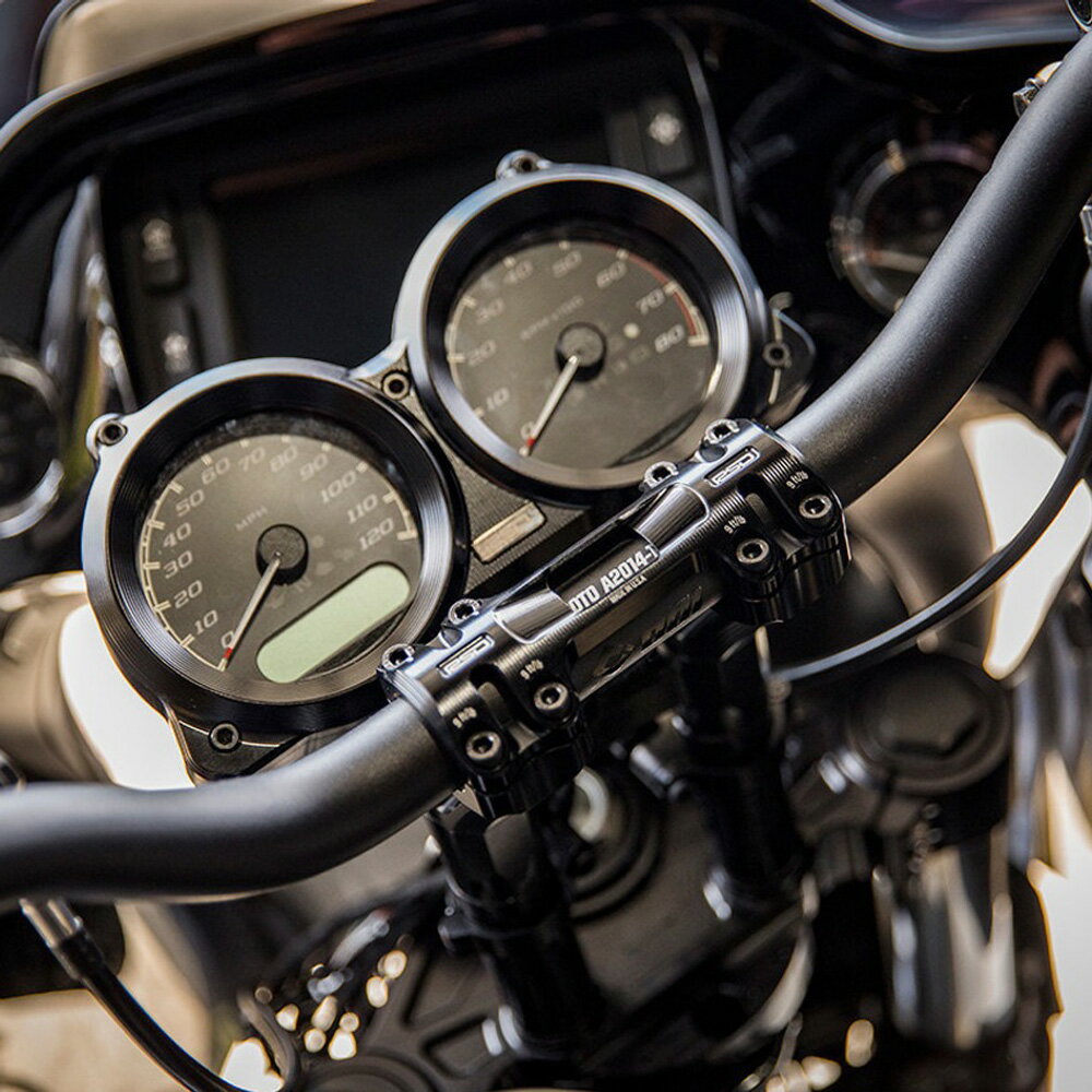 【適合】 2018〜2024 FXBB、FXBBS、FXBR、FXBRS、FXLRST、FXRST、FXST 1.25インチ径ライザー/Tバー用 【商品説明】 ハーレー M8ソフテイル ストリートボブ、ブレイクアウト、ローライダーST、スタンダード、エルディアブロに標準装着の純正小型デジタルメーターを、ライザーにマウントする、移設キットです。 1.25インチ径のライザーやTバーへマウント可能です。 特にローランドサンズデザインのSECTOR(セクター)シリーズのライザーにデザインマッチします。 高品質な6061アルミニウム製。CNCマシンによる削り出し加工品です。 ゲージハウジングはロープロファイルでスリムなルックスです。 取付け場所に応じてアームとゲージの角度を調整できます。 ※ライザーは付属しません 【サイズ】 クランプ径1.25インチ 【カラー】 ブラック 【メーカー】 Roland Sands Design(ローランドサンズデザイン) 【商品番号】 01-13-0006-B