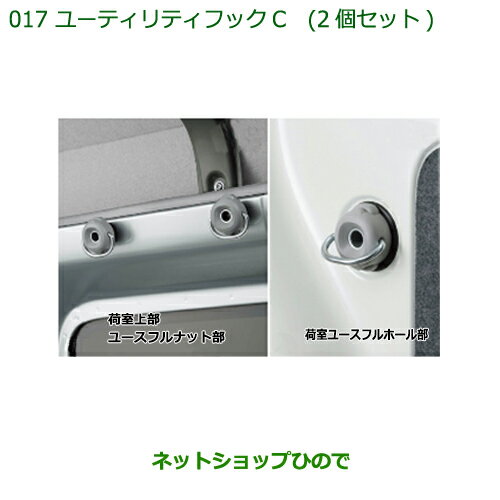 純正オプション 純正部品 純正用品 純正パーツ 自動車部品 カーアクセサリー ディーラーオプション car part トヨタ純正部品 ニッサン純正部品 ホンダ純正部品 三菱純正部品 ダイハツ純正部品 スズキ純正部品 スバル純正部品 マツダ純正部品 ブリヂストン キー照明 ルームランプ フットライト ルームランプバルブ フロント用 サイド用 リヤ用 トノカバー 充電ケーブル ルーフキャリア ルーフラック モール ハロゲンランプ LEDランプ イルミネーション スポイラー フロアマット コーナーセンサー ルーフレール エンジンスターター スノーレジャー用フロアマット 車載防災セット リモートスタート ワイドバイザー ドアバイザー カーAV取付キット 車検部品 車検パーツ バックカメラ エンブレム バックドアハンドル ラゲージネット フロアカーペットマット ラバーマット スーリー シートカバー トレーマットセット 洗車セット プライバシーカバー リヤスポイラー ウッド調ステアリング サンシェード スピーカー マットガード ペットシートカバー ディズニー フォレスター クラウンアスリート ヴェゼル トヨタbB スペーシア ヴォクシー ラパン ワゴンR レヴォーグ ヴォクシー エルグランド セレナ シエンタ オデッセイ ハリアー プラド アトレーワゴン ミラココア エクストレイル N-BOX タントカスタム クラウン ハイエース アクア プリウス ステップワゴン ジムニー ハスラー ソリオ スイフト ヴェルファイア アルファード ウイッシュ STi TRD ◆上記車種商品以外も取扱いしております◆商品説明 荷室上部のユースフルナット部には、最大8個(デッキバンは最大4個、標準ルーフ車は最大2個)。 ベルトライン部のユースフルホール部には最大4個装着可能(デッキバンは装着不可)。 ※後席アシストグリップ部に装着される場合は、標準装備のアシストグリップは取り外しとなります。 注)ユーティリティフックには種類があり、それぞれボルトの長さが異なり、装着位置・お車のグレードによって装着可能なフックが異なります。 指定位置以外に装着された場合、車両部品へ損傷を与える可能性がありますので、十分ご注意ください。 ※フロア部のユースフルナットへは装着できません。 ※ユーティリティフックAは荷室上部ユースフルナット専用です。 ※デッキバンにユーティリティフックA(荷室上部ユースフルナット専用)をお取付になる場合、荷室上部のユースフルナット8ヶ所のうち前方4ヶ所のみ装着可能。 同時装着不可 荷室上部のユースフルナットに装着時: [1]〜[5]アッパーシステムレール商品、[6]〜[9]マルチレール商品、[10]ハンガーバー、[186]ロッドホルダー(5本積) 同位置に装着時: [11]ネットラックリヤ、[12]システムバーセット(アッパー)、[13]システムバー(ロア)、[135]アシストグリップ(つり革タイプ) ユースフルホールに装着時: [14]荷室ボードセット 耐荷重 1.5kg/1個 「適用車種表」をご確認の上お買い求めください。 ○...適用車種欄の(車両グレード)に対して適用 −...適用車種欄の(車両グレード)に対して不適用 標...標準(メーカー)で装着済(メーカーオプションは除く) ※...適用に関しては注を参照のこと [注意事項、他] ※ユーティリティフックA:後席アシストグリップ部に装着の場合、アシストグリップは取外しとなります。 ※ユーティリティフックC:ビジネスパック車には装着不可。 【適用車種表 ユーティリティフックA 2WD/4WD】 ハイルーフ クルーズターボ“SA III”※ ハイルーフ クルーズ“SA III”※ ハイルーフ デラックス“SA III”○ ハイルーフ デラックス○ ハイルーフ スペシャルクリーン“SA III”○ ハイルーフ スペシャルクリーン○ ハイルーフ スペシャル“SA III”○ ハイルーフ スペシャル○ 標準ルーフ スペシャルクリーン“SA III”○ 標準ルーフ スペシャルクリーン○ 標準ルーフ スペシャル“SA III”○ 標準ルーフ スペシャル○ ハイルーフ デッキバンG“SA III”※ ハイルーフ デッキバンL“SA III”○ ハイルーフ デッキバンL○ 【適用車種表 ユーティリティフックB 2WD/4WD】 ハイルーフ クルーズターボ“SA III”○ ハイルーフ クルーズ“SA III”○ ハイルーフ デラックス“SA III”○ ハイルーフ デラックス○ ハイルーフ スペシャルクリーン“SA III”○ ハイルーフ スペシャルクリーン○ ハイルーフ スペシャル“SA III”○ ハイルーフ スペシャル○ 標準ルーフ スペシャルクリーン“SA III”○ 標準ルーフ スペシャルクリーン○ 標準ルーフ スペシャル“SA III”○ 標準ルーフ スペシャル○ ハイルーフ デッキバンG“SA III”− ハイルーフ デッキバンL“SA III”− ハイルーフ デッキバンL− 【適用車種表 ユーティリティフックC 2WD/4WD】 ハイルーフ クルーズターボ“SA III”※ ハイルーフ クルーズ“SA III”※ ハイルーフ デラックス“SA III”− ハイルーフ デラックス− ハイルーフ スペシャルクリーン“SA III”− ハイルーフ スペシャルクリーン− ハイルーフ スペシャル“SA III”− ハイルーフ スペシャル− 標準ルーフ スペシャル
