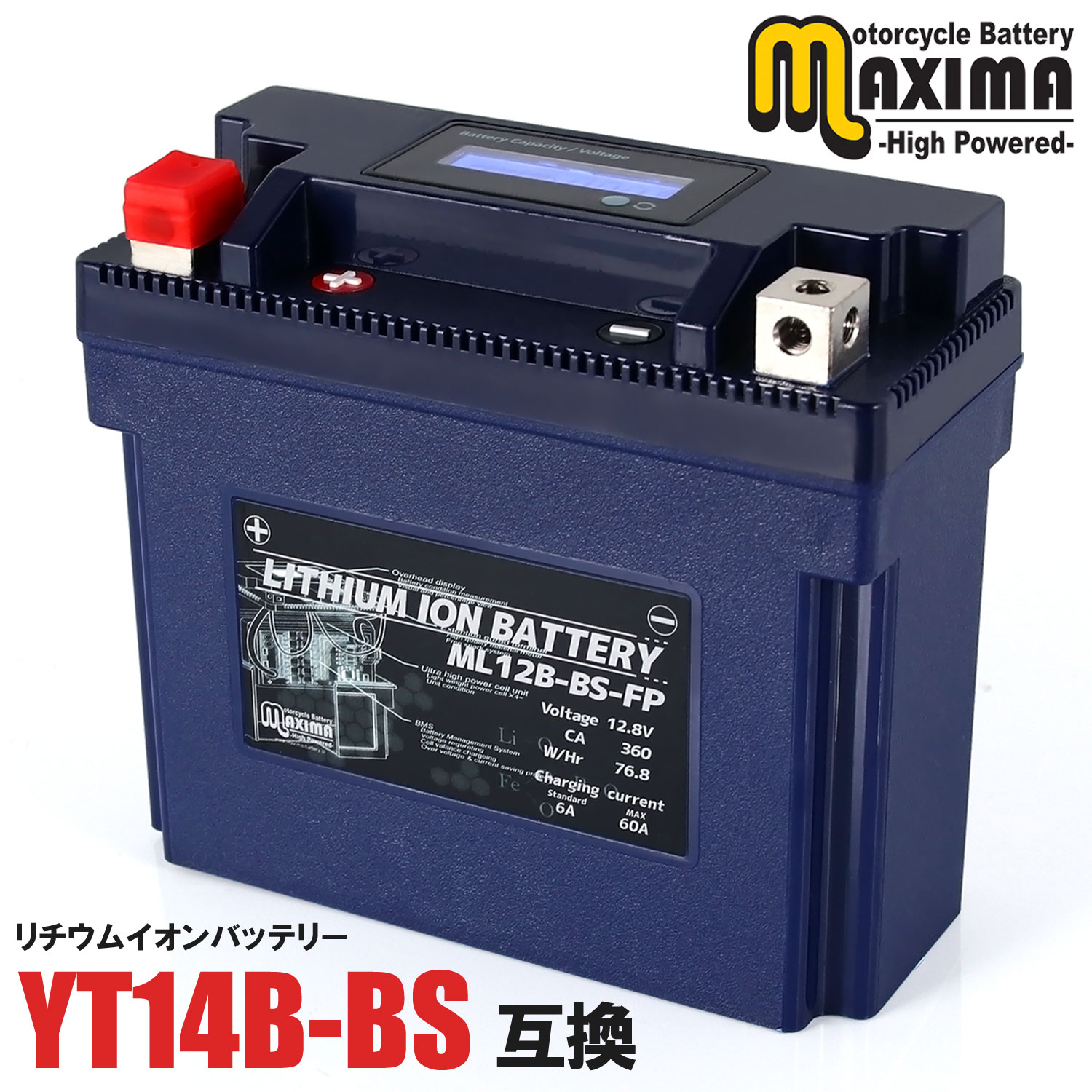 商品 リチウムイオンバッテリー■型番:ML12B-BS-FP■電圧:12.8V■容量:76.8Wh■サイズ:(L)約150mm×(W)約65mm×(H)約130mm+15mmスペーサー付属■数量:1個 メーカー相互性 ■GSユアサバッテリー:YT12B-BS/GT12B-4/YT14B-BS/GT14B-4■古河バッテリー:FT12B-4■ACデルコ:DT12B-4■SHORAI:LFX14A1-BS12/LFX18A1-BS12 マキシマバッテリーリチウムイオンバッテリーの強み ■BMS(バッテリーマネジメントシステム)内蔵しており、高性能で安全性の高いバッテリーです。■鉛バッテリーの約1.5倍の始動性能で大型車両も一発始動!■従来のバッテリーに比べて、約1/3の重量を実現。車両の軽量化に最適です。■自己放電に強いため長期保存に適しており、始動性にも優れております。■電圧・容量がすぐ分かる液晶ディスプレイ付き!■LifePO4(リン酸鉄リチウムイオン)テクノロジー採用。ガスによる発火や爆発の危険性を低減します。■希硫酸を使用していないので、横倒しで使用することもできます。 安心ジャンピングサービス ■ジャンピングサービスとは?誤ってバッテリーを上げてしまった場合、バッテリーにバッテリーを繋げエンジンを始動させるサービスです。専門スタッフが急行し車両を点今後、ジャンピングスタートを開始いたします。専用のフリーダイヤル回線にて365日24時間対応致します。■ジャンピングサービス期間バッテリー本体 お買い上げ日より12ヶ月間 安心の1年保証 ■保証の内容保証期間(お買い上げ後12ヶ月間)内において、別紙の取扱説明書にそった正常なご使用状態で万が一故障が生じた場合には、保証規定により無料で交換いたします。■保証期間バッテリー本体 お買い上げ日より12ヶ月間 ※消耗品、付属品等は除く 品質 ■ISO9001(品質マネジメントシステム規格)■ISO14001(環境マネジメントシステム規格)■CE規格(欧州規格)■UL規格(北米規格)品質管理及び品質保証のための国際標準規格を満たした工場にて生産されております。また、品質管理及び品質保証だけではなく、生産工場では地球温暖化防止の為、環境問題の取り組みも重視しております。 ご購入前の確認事項 ■必ずご自身のオートバイにて、バッテリー型番やサイズ・形状、端子位置・端子形状をよくご確認下さい。■車両充電電圧の確認をしてください※車両の充電電圧が14.8V以下の車両に装着可能となります。 充電電圧を調べる方法 1:電圧計(テスター等)をバッテリー端子に当てる。 2:エンジン回転数を2,000回転以上に保ち、その時の電圧を測定してください。 注意事項 ■リチウムイオンバッテリーは12.8V以下では使用しないで下さい。■ご使用前に補充電を行って下さい。■また充電の際には下記充電器は使用しないで下さい。1:充電電圧が15.0V以上の充電器2:サルフェーション機能などが付いている充電器※充電の際はリチウムイオンバッテリー専用充電器を推奨いたします。 お取り付け ■バッテリーを車体からはずされる時は、必ず−端子からはずし、取り付ける際は+端子から取り付けてください。■バッテリーの取扱には知識・技術などが必要になりますので個人での取扱には十分な理解を持っていただいた上でお願いいたします。 適合車種 ■ヤマハBT1100ブルドッグ(RP05)、FJR1300/P(5JW)、FJR1300A(5JW/RP27J)、FJR1300AP/AS(5JW/RP27J)、FZ1(RN16)、FZ400(4YR)、FZ6-N/(RJ07)、FZ6-R、FZ6-S Fazer(RJ07)、FZS1000フェザー(5LV)、FZS600Fazer、MT-01/S、TDM850(RN03J)、TDM900(RN0819)、XJ6/ABS、XJ6Fディバージョン、XJ6N/ABS(20S5)、XJ6ディバージョン/ABS、XJR1300(RP01J/RP03J)、XJR1300SP(RP03J)、XV1700ASロードスターミッドナイト(5VRM)、XV1700ATMTロードスターミッドナイトシルバーロード、XV1900A、XV1900CU、YZF-R1(RN01/RN09)、ドラッグスター1100(VP10J/VP13J)、ドラッグスター400(4TR/VH01J)、ドラッグスタークラシック400(4TR/VH01J)、ドラッグスタークラシック10thアニバーサリー(VP13J)、ドラッグスタークラシック1100(VP13J)■カワサキZX-10R(ZXT00C/ZXT00D/ZXT00E)■ドゥカティモンスターS2R、モンスター400(ZDM400M/ZDMM300AA/ZDMM407AA)、モンスター400S、モンスター600、モンスター600ダーク、モンスター620(ZDMM400AA)、モンスター620S、モンスター620ダーク、モンスター695、モンスター696、モンスター696+、モンスター750(ZDMM300AA)、モンスター750ie(ZDM400AA)、モンスター750ダーク、モンスター796、モンスター800(ZDMM406AA)、ムルティストラーダ620/ダーク(ZDMA103AA)、ハイパーモタード796、ハイパーモタード821、Supermono、SUPERBIKE748(ZDMH300AA/ZDM748S)、SUPERBIKE748R/S(ZDMH300AA)、SUPERBIKE748SP/SPS(ZDM748S)、SUPERBIKE749(ZDM500AA)、SUPERBIKE749R(ZDMH501AG/ZDMH501AF)、SUPERBIKE749S(ZDMH500AD/ZDMH500AC/ZDMH500AA)、SUPERBIKE848、748ビポスト、748モノポスト、750Sport(ZDM750S)、750SS/HF(ZDM750SC)、750SSie(ZDMV200AA)、600SSHF、600SS、SUPERBIKE848Evo、STREETFIGHTER848、900モンスター、900SSie、モンスター900(ZDM900M/ZDM1NC3NX)、モンスター900ie、モンスター900S(ZDM900M)、SS900、SS900FE(ZDM906SC2)、SS900HF、955Corsa、デスモセディチRR、スクランブラーアーバンモタード、スクランブラーアイコンダーク、スクランブラーナイトシフト、モンスター821ステルス、ムルティストラーダ950S、パニガーレV4、