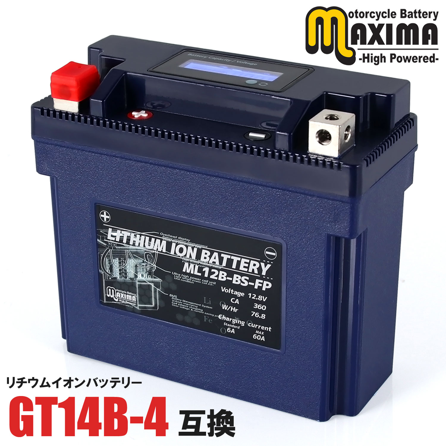 商品 リチウムイオンバッテリー■型番:ML12B-BS-FP■電圧:12.8V■容量:76.8Wh■サイズ:(L)約150mm×(W)約65mm×(H)約130mm+15mmスペーサー付属■数量:1個 メーカー相互性 ■GSユアサバッテリー:YT12B-BS/GT12B-4/YT14B-BS/GT14B-4■古河バッテリー:FT12B-4■ACデルコ:DT12B-4■SHORAI:LFX14A1-BS12/LFX18A1-BS12 マキシマバッテリーリチウムイオンバッテリーの強み ■BMS(バッテリーマネジメントシステム)内蔵しており、高性能で安全性の高いバッテリーです。■鉛バッテリーの約1.5倍の始動性能で大型車両も一発始動!■従来のバッテリーに比べて、約1/3の重量を実現。車両の軽量化に最適です。■自己放電に強いため長期保存に適しており、始動性にも優れております。■電圧・容量がすぐ分かる液晶ディスプレイ付き!■LifePO4(リン酸鉄リチウムイオン)テクノロジー採用。ガスによる発火や爆発の危険性を低減します。■希硫酸を使用していないので、横倒しで使用することもできます。 安心ジャンピングサービス ■ジャンピングサービスとは?誤ってバッテリーを上げてしまった場合、バッテリーにバッテリーを繋げエンジンを始動させるサービスです。専門スタッフが急行し車両を点今後、ジャンピングスタートを開始いたします。専用のフリーダイヤル回線にて365日24時間対応致します。■ジャンピングサービス期間バッテリー本体 お買い上げ日より12ヶ月間 安心の1年保証 ■保証の内容保証期間(お買い上げ後12ヶ月間)内において、別紙の取扱説明書にそった正常なご使用状態で万が一故障が生じた場合には、保証規定により無料で交換いたします。■保証期間バッテリー本体 お買い上げ日より12ヶ月間 ※消耗品、付属品等は除く 品質 ■ISO9001(品質マネジメントシステム規格)■ISO14001(環境マネジメントシステム規格)■CE規格(欧州規格)■UL規格(北米規格)品質管理及び品質保証のための国際標準規格を満たした工場にて生産されております。また、品質管理及び品質保証だけではなく、生産工場では地球温暖化防止の為、環境問題の取り組みも重視しております。 ご購入前の確認事項 ■必ずご自身のオートバイにて、バッテリー型番やサイズ・形状、端子位置・端子形状をよくご確認下さい。■車両充電電圧の確認をしてください※車両の充電電圧が14.8V以下の車両に装着可能となります。 充電電圧を調べる方法 1:電圧計(テスター等)をバッテリー端子に当てる。 2:エンジン回転数を2,000回転以上に保ち、その時の電圧を測定してください。 注意事項 ■リチウムイオンバッテリーは12.8V以下では使用しないで下さい。■ご使用前に補充電を行って下さい。■また充電の際には下記充電器は使用しないで下さい。1:充電電圧が15.0V以上の充電器2:サルフェーション機能などが付いている充電器※充電の際はリチウムイオンバッテリー専用充電器を推奨いたします。 お取り付け ■バッテリーを車体からはずされる時は、必ず−端子からはずし、取り付ける際は+端子から取り付けてください。■バッテリーの取扱には知識・技術などが必要になりますので個人での取扱には十分な理解を持っていただいた上でお願いいたします。 適合車種 ■ヤマハBT1100ブルドッグ(RP05)、FJR1300/P(5JW)、FJR1300A(5JW/RP27J)、FJR1300AP/AS(5JW/RP27J)、FZ1(RN16)、FZ400(4YR)、FZ6-N/(RJ07)、FZ6-R、FZ6-S Fazer(RJ07)、FZS1000フェザー(5LV)、FZS600Fazer、MT-01/S、TDM850(RN03J)、TDM900(RN0819)、XJ6/ABS、XJ6Fディバージョン、XJ6N/ABS(20S5)、XJ6ディバージョン/ABS、XJR1300(RP01J/RP03J)、XJR1300SP(RP03J)、XV1700ASロードスターミッドナイト(5VRM)、XV1700ATMTロードスターミッドナイトシルバーロード、XV1900A、XV1900CU、YZF-R1(RN01/RN09)、ドラッグスター1100(VP10J/VP13J)、ドラッグスター400(4TR/VH01J)、ドラッグスタークラシック400(4TR/VH01J)、ドラッグスタークラシック10thアニバーサリー(VP13J)、ドラッグスタークラシック1100(VP13J)■カワサキZX-10R(ZXT00C/ZXT00D/ZXT00E)■ドゥカティモンスターS2R、モンスター400(ZDM400M/ZDMM300AA/ZDMM407AA)、モンスター400S、モンスター600、モンスター600ダーク、モンスター620(ZDMM400AA)、モンスター620S、モンスター620ダーク、モンスター695、モンスター696、モンスター696+、モンスター750(ZDMM300AA)、モンスター750ie(ZDM400AA)、モンスター750ダーク、モンスター796、モンスター800(ZDMM406AA)、ムルティストラーダ620/ダーク(ZDMA103AA)、ハイパーモタード796、ハイパーモタード821、Supermono、SUPERBIKE748(ZDMH300AA/ZDM748S)、SUPERBIKE748R/S(ZDMH300AA)、SUPERBIKE748SP/SPS(ZDM748S)、SUPERBIKE749(ZDM500AA)、SUPERBIKE749R(ZDMH501AG/ZDMH501AF)、SUPERBIKE749S(ZDMH500AD/ZDMH500AC/ZDMH500AA)、SUPERBIKE848、748ビポスト、748モノポスト、750Sport(ZDM750S)、750SS/HF(ZDM750SC)、750SSie(ZDMV200AA)、600SSHF、600SS、SUPERBIKE848Evo、STREETFIGHTER848、900モンスター、900SSie、モンスター900(ZDM900M/ZDM1NC3NX)、モンスター900ie、モンスター900S(ZDM900M)、SS900、SS900FE(ZDM906SC2)、SS900HF、955Corsa、デスモセディチRR、スクランブラーアーバンモタード、スクランブラーアイコンダーク、スクランブラーナイトシフト、モンスター821ステルス、ムルティストラーダ950S、パニガーレV4、