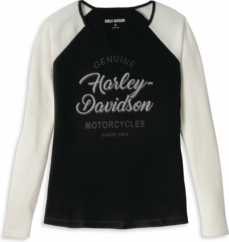 Harley-Davidson Silver Wing Font Graphic Notch Neck Colorblock Waffle Knit Top For Women- Block Design/Black Beauty | 96242-2