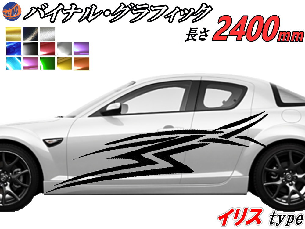 サイドデカール (イリス) 【商品一覧】 汎用 左右2枚1セット 幅500mm×長さ2400mm (2.4m) 転写シート付属 バイナル グラフィック デコライン ステッカー トライバル チタニウム ブラッシュド アルミ調 クローム メタリック ストライプ 自動車 オリジナル