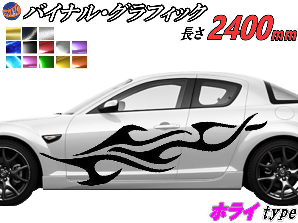 ★★商品説明★★待望のサイドデカール入荷!!全長2.4mのビッグサイズ!!破格にて提供しております。簡単に、デモカーやワイルドスピードで活躍するようなカスタム カーにドレスアップ!!自動車用(車輌用)のボディステッカーです。当店で抜群に人気が高く、周りと被らない斬新なデザインを豊富に取り揃えました。周りへのアピールポイントが高く、デコライン、トライバルバイナルストライプ、サイドストライプ等の呼び名で永く愛されている定番アイテムです。ドリフト好きのあなたに!屋外耐候年数 約3年※使用状況により異なります。雨天、洗車も問題ございません。 【セット内容】 ・ステッカー左右1枚ずつ(2枚)の1セット ・転写シート左右1枚ずつ(2枚)の1セット ※転写シートのみの販売はしていません。 【デザイン/サイズ】 デザイン … 画像1枚目をご参照下さい。 サイズ … 幅50cm × 長さ240cm 【カラー】 ヘアラインタイプ シルバー(銀)/ブラック(黒)/ゴールド(金) メッキタイプ シルバー(銀)/レッド(赤)/ブラック(黒) グリーン(緑)/ゴールド(金)/ピンク(桃) ライトブルー/ディープブルー/パープル(紫)/オレンジ(柿) 購入時、ご希望のカラーをご選択下さい。 切り抜きタイプの超簡単施工!! 付属の転写シートをサイドデカールの上に貼り、 転写シートをめくると、サイドデカールも一緒にめくれますので そのままお好きな所に貼れば、一瞬でスポーティ仕様に!! 豊富なラインナップで出品を致しております。バイナルグラフィックス(ボンネット/サイドデカール)はこちら 【注意】 ・完全受注生産の為、交換・キャンセル・返品一切受付不可です。 予めご了承下さいますようお願い申し上げます。 ・記載のサイズは角度によって、当然ながら差が出て参りますので あくまで参考とお考え下さい。 ・画像のお車はあくまで参考ですので、必ず実車のサイズを確認してから ご購入下さいますようお願い申し上げます。 ・施工前に、施工面の脱脂はしっかりと行って下さい。 ・常温、または寒い地域や時期の場合は、施工面を暖めてから施工下さい。 ★★発送方法/送料★★下記【全国送料表】をご確認下さい。複数の商品を同梱可能です。※同梱をご希望の場合、必ず同じお買い物カゴ(カート)でご注文下さい。※別々のお買い物カゴで注文された場合は別々に梱包し発送致します。その為、送料・代引き手数料は発送個数分請求させて頂きます。★発送に関する注意事項★---------------------------------------- 当方指定宅急便ですので配送業者は選択できません。 時間指定は対応いたしておりません。発送連絡に記載の問い合わせ番号でご自身でご確認頂けます。離島への発送は行っておりません。 ----------------------------------------★商品代引★ 宅急便送料+別途手数料370円 休業日 商品ページ左バナーカレンダーに記載★★支払方法★●楽天銀行 振込●商品代引●クレジットカード決済●コンビニ決済(前払い)●後払い決済
