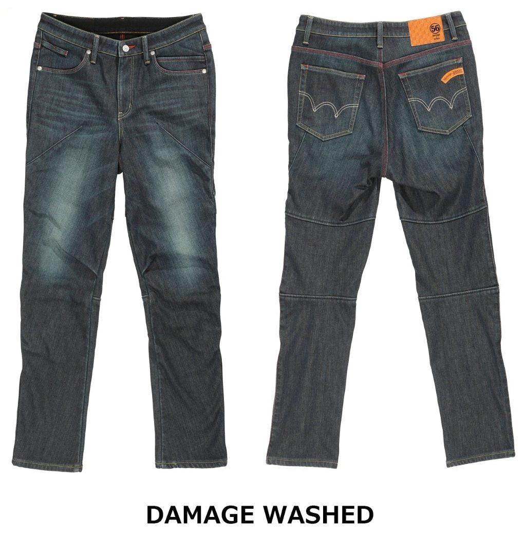 ■商品概要【仕様】ダメージウォッシュ【素材】表地 コットン79%、ナイロン20%、ポリウレタン1%裏地 ポリエステル 100%革ラベル 合成皮革■詳細説明56design×EDWINのコラボレーションジーンズ WILD FIRE ウインターモデル。履いた時のシルエットに徹底的にこだわり、履き心地を維持したまま、よりスタイリッシュな見た目となっております。素材は、EDWINが開発した防風性+透湿性+ストレッチ性に優れた素材に、耐久性を追求しコーデュラ?デニムファブリックを採用。エドウィンの通常生地と比べた耐摩耗性検査で、通常の20倍以上の摩擦強度結果を叩き出した驚きのデニムです。防風フィルムで風を遮り起毛裏地で効率よく保温、さらにストレッチ性に優れ強度のある、まさにライディングに最適なジーンズ生地です。この生地を56designと共同開発のノウハウを生かしたライディングポジションでも快適に履けるよう、立体裁断で仕上げた冬のライダーの為のジーンズが完成しました。膝部分はニープロテクターを装着できるポケットを装備。表地とあわせ3枚重ねとなる「トリプルニー」構造はそのままに、オプションで別売りOptionKneePadsを挿入できます。ポケット部分のミシンステッチの糸を切って、プロテクターの高さを調整して下さい。ライダー用ジーンズとして56designオリジナルでカッティングされた、立体裁断 3D system。内股にマチを追加し、より開脚し易く改良しました。ライディングフォームでも裾が上がりにくく、膝の曲げ伸ばしに負担がかからないデザインは健在です。車体を傷つけにくい低頭リベットの工夫ももちろんそのままに、ワンウォッシュとダメージウォッシュ加工の2タイプをバリエーションに加えています。この冬の必須アイテム、ライダーのためのウィンタージーンズです。■注意点※CORDURA?は、耐久性に優れたファブリックに対するインビスタ(INVISTA)社の登録商標です。※着用される際は、レーシングスーツのようなイメージで最初に股上を深く履いてください。そのあとしゃがみ込んで膝の位置を合わせて頂くと、驚くほど動きやすくなります。※画像には他のカラーが含まれています。※メーカー都合により商品の仕様変更がある場合がございます。ご了承ください。