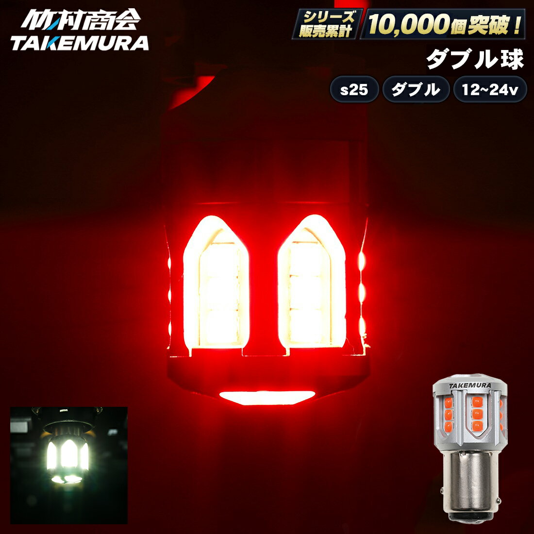 S25 ダブル LED レッド ホワイト bay15d 180度 段違いピン ブレーキ ブレーキ球 ブレーキランプ テール テールランプ 12v/24v兼用 トラック 単車 バイク 軽トラ オートバイ 原付 ホイールローダー 旧車 簡単取付 省エネ 視認性向上 放熱設計 ストップランプ 竹村商会