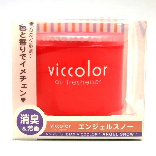 viccolor ビッカラエンジェルスノーあたたかなフローラルフルーティーを、アンバー、バニラでまとめた高級感のある香り。★使用方法●キャップを外し、アルミシールを取り除いてください。※半透明の薄皮状のフィルムが残った場合は取り除いてください。●再びキャップを取り付けてください。●取り付け場所は車内の水平な所を選び汚れをキレイに落としてください。●両面テープを容器の底に貼り取り、取り付け位置にしっかりと固定して下さい。【仕様】名称:自動車用消臭芳香剤形式:ゲル状内容量:85g香り:エンジェルスノーメーカー:ダイヤケミカル品番:7315