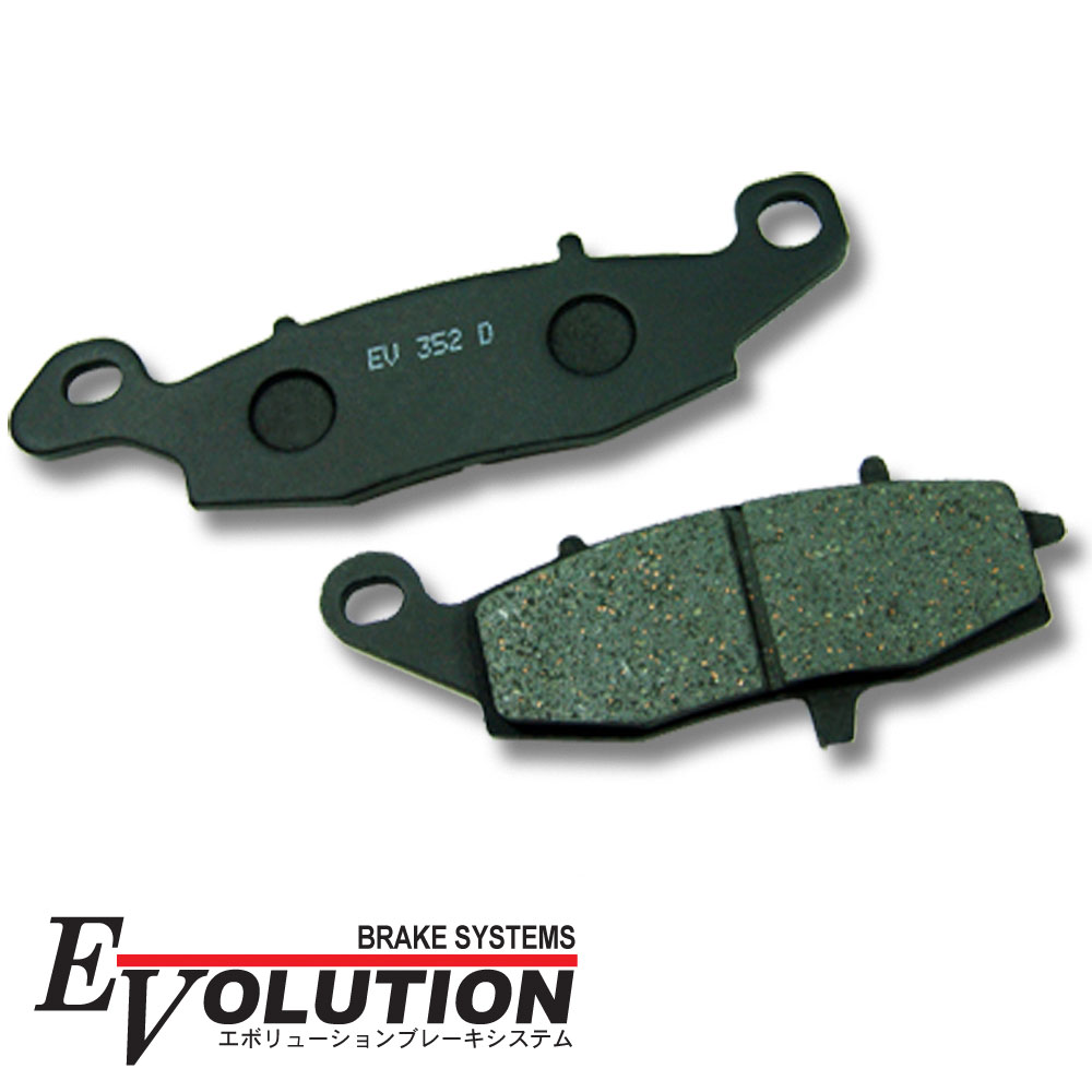 商品名■セミメタル ブレーキパッド (2枚1組)商品説明■メーカー:エボリューション■型番:EV-352D■エボリューションブレーキパッドは銅フレークを配合したセミメタルパッドです。■コストパフォーマンスに優れたストリート向けスポーツパッドになります。■低中速から高速まで安定した制動力と耐フェード性、ウェット時の安定性を発揮し街乗りからスポーツ走行まで幅広く対応致します。お取り付け■重要保安部品の為オートバイショップ又は、二輪自動車整備士有資格者の指導、監督の下お取り付け下さい。※パッド装着後は、走行前に必ずブレーキを作動させ、ブレーキが正常に機能しているかを確認して下さい。よくある質問Q:交換時期はどのくらいになりますか?A:磨り減ってしまったブレーキパッドは大変危険です。摩擦材が1mmになりましたら交換して下さい。Q:純正品との厚さの差はありますか?A:形状が同じでも摩擦材の厚さは多種多様です。※摩擦材の厚さでパッドの寿命が異なる場合がある事をご理解ください。Q:価格が安値ですが、品質、性能に問題はありませんか?A:品質に関しましては、あらゆる品質管理基準を満たしておりますので、純正ブレーキパッドと比べても遜色なくご使用頂けます。また、生産拠点を海外に移行することによりコストパフォーマンスを図り、非常にリーズナブルな価格にてご提供させて頂くことが可能となりました。純正ブレーキパッドよりワンランク上の制動力、コントロール性能を実現致しました!!Q:ブレーキパッドの慣らしは必要ですか?A:慣らしは不要ですがローターとの当たり(接地面とローターが馴染む)が出るまで過激なブレーキングは避けて下さい。Q:ブレーキの鳴きが出てしまいますがどうしたらいいのでしょうか? A:装着前にブレーキの角を落とし(面取り)ブレーキパッドのピストン接地面に専用グリスを塗り装着して下さい。Q:複数注文したいのですが、価格は安くなりませんか?A:業者様向けの卸販売も行っておりますのでご相談下さい。注意事項■フロントダブルディスク車は必ず左右セットで交換して下さい。■モデル年式によっては形状が異なる場合がございますので、お求め前に必ずご自身のオートバイにて、形状をご確認下さい。梱包サイズ■荷物のサイズは60です。参考適合表 車名 型式(年式) 適合 SUZUKI バンディット250 GJ77A F VZ1500 ('09) F ST250/E NJ4AA F Volty Type I/T NJ47A('99-'04) F グラストラッカー/ビッグボーイ NJ47A/NJ4BA F グラディウス 400 VK58A F SV400/S VK53A('00-'05) F バンディット600S ('00-'03) F GSX600F Katana ('98-'06) F V-ストーム 650 ('04-'09) F グラディウス 650 ('09) F SV650/ABS VP52A F SV650S ('99-'09) F Inazuma 750 ('98) F GSX750F Katana GR78A F DR800 Big ('96) F V-Strom ('02-'09) F ブルバード 1500/LC ('05-'09) F イントルーダー1500 LC VY51A F KAWASAKI エリミネーター250V VN250A F バルカン クラシック400 VN400A F バルカン 400 ドリフター VN400D F ゼファーχ ZR400C F ZRX/II ZR400E F ER-6n ER650A F ER-6f ER650 F KLR650 KL650A F KLE650 ('08-'09) F ZR750 ZR750H F Z750S ('06-'07) F ゼファー750 RZ750C F ゼファー750 RS ZR750C F ZR-7/S ZR750F F バルカン 800 クラシック VN800B F バルカン 800 ドリフター VN800C F バルカン 900クラシック/LT VN900B F バルカン 900 カスタム VN900C F KZ1000 Police Z1000P F ゼファー1100 RS ZRT10A F GPZ 1100/ABS ZXT10E/ZXT10F F バルカン 1500 クラシック/F.I. VNT50D F バルカン 1500 ドリフター VNT50J F バルカン 1500 Nomad F.I. ('99-'04) F バルカン 1600 クラシック ('03-'08) F バルカン 1600 Nomad ('05-'08) F バルカン 1700 クラシック/LT ('09) F バルカン 1700 Nomad ('09) F ■適合:F(フロント)/ R(リア)