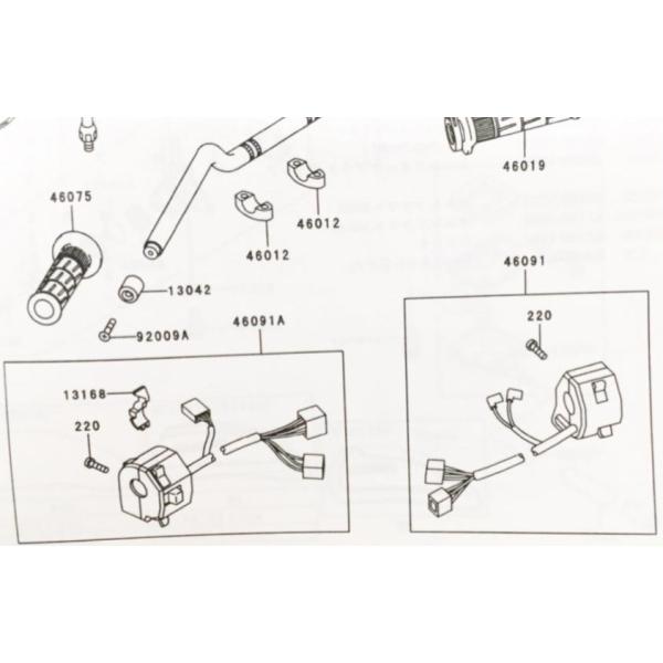 ■ 同車種であっても年式や車体番号や仕様によって使用する純正部品が違う場合が有ります。 部品番号を記載してありますので、必ず部品番号にて適合確認をお願いいたします。 ■ 部品が廃盤になってしまった場合は、ご注文をキャンセルさせていただきます。 お支払い手続き済みの場合は、各お支払方法のルールにてお支払のキャンセルまたはご返金となりますのでご安心ください。 ■ 部品がメーカー欠品中の場合は、お客様へご注文を継続されるかキャンセルされるかの確認を致しますのでご安心ください。 ■ 純正部品はメーカー側の管理の都合で品番変更される場合があります。 パーツリストに記載されている部品番号や商品ページに記載してある部品番号と違う物が納品となる場合が有りますが、現在メーカーが正式に提供する純正部品となりますのでご安心ください。 ■ 現在メーカーが補修用として提供する純正部品は、当時の物と比較すると材質や色目や形状などが変更されている場合があります。 もちろん取り付けたり使用するといった機能面では全く問題ありませんのでご安心ください。 ■ パーツリスト上では含まれない周辺部品が含まれて来たり、逆にパーツリスト上では含まれる周辺部品が含まれて来なかったりと、セット内容がメーカー側にて変更される場合が有りますのでご了承ください。 ■ 純正部品は同じ部品であっても僅かに色目や塗装状態などに個体差が有る場合がありますが、全てメーカーの検査に合格した物となります。 明らかに著しい違いが有る場合を除き交換不可となりますのでご了承ください。純正部品は基本的に返品&交換不可となります。 ■ 部品の取り付け作業は整備資格のあるプロショップにてお願いいたします。 ■ 万が一不良品や誤出荷、遅延などによりお客様側に工賃などの金銭的な影響が生じた場合でも、工賃や遅延料などの関連費用の補填は致しませんのでご了承ください。 不良品や誤出荷に対しては、良品への交換または良品がご用意出来ない場合は部品代のご返金となります。 部品番号が記載された部品の梱包資材が無い場合は、理由に関わらず返品不可となります。 ■ ご購入いただくと同時に上記内容をご了解いただいた事と致します。ゼファー750(ZR750C) ★車体番号ZR750C-075000まで ハンドルスイッチ右 (右コントロールハウジング) 図中(46091番) 46091-1763 (46091-1553 より品番統一) 販売内容は以下になります。 ●図中(46091番) 46091-1763 (46091-1553 より品番統一) 1個 メーカーの純正部品供給体制変更に伴い、カワサキ純正部品は当社ご提供価格での販売となります。
