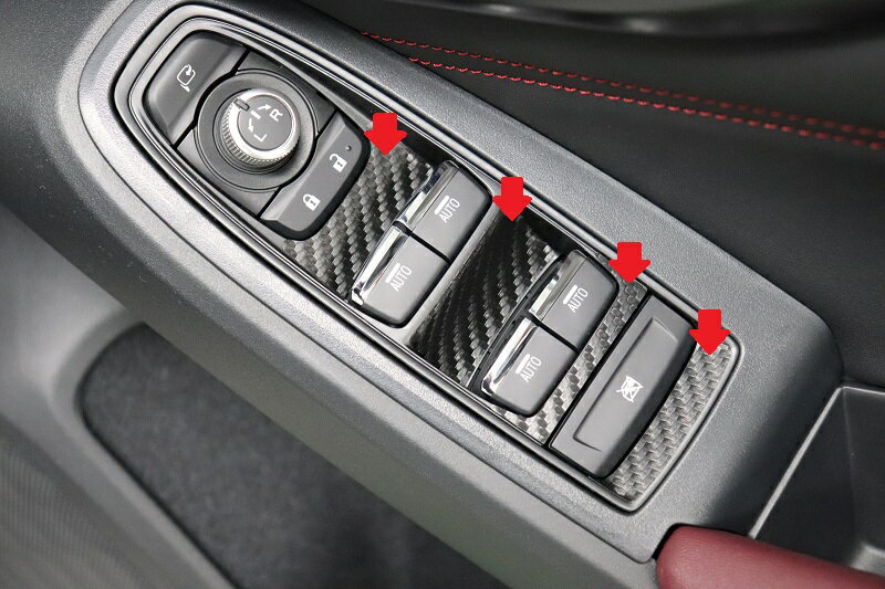 ■レヴォーグVN系専用シート 車内 パワーウインドウスイッチシート 1台分10点セット ■パワーウインドウスイッチ周辺に貼り込みするシート、運転席4点、その他各2点の1台分10点セットです。パネルは取り外しせずに貼り込み可能です。 ■シートカラーはブラックカーボンシート、グロスブラックカーボンシート、ピアノブラックシート、レッドシート、ブルーシートからお選びいただけます。 ■パネルは取り外しせずに貼り込み可能です。 ■適合アプライドモデル:A型・B型・C型 <適合確認車両情報> ■A型:R2年11月登録車 型式4BA-VN5 グレードSTIスポーツ EX ■B型:R3年11月登録車 型式5BA-VNH グレードSTIスポーツR EX ■C型:R5年7月登録車 型式5BA-VNH グレードSTIスポーツ# ■必ず写真と同じパネルが付いているか確認してご購入ください。 ■ご注文後のカットになり、カット後は変更、キャンセルが出来ませんのでご注意ください。 ■受注製作のため、発送までにお時間をいただきますがご了承ください。納期については配送予定欄、納期情報にてご案内しておりますのでご確認ください。 ■グロスブラックカーボンシートは発送までに3週間程度お時間をいただきます。 ■グロスブラックカーボンシートは料金が2倍になります。 ■グロスブラックカーボンシートは5,000円(税別)がプラスになります。その料金はご購入手続き時の自動計算には反映されません。ご注文後、当店にて金額修正を行い、正しいご請求金額をお知らせ致します。