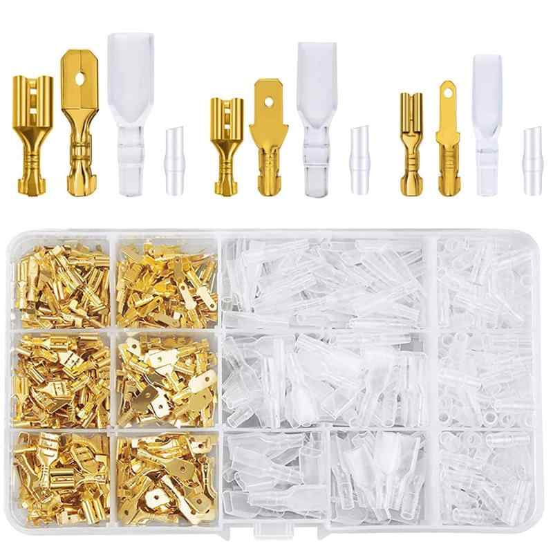 平型端子セット 480個 金色のオス/メス セット 110型 187型 250型 絶縁スリーブ カバー付き 接続 圧着 ファストン 端子 コネクター 自動車 バイク スピーカー