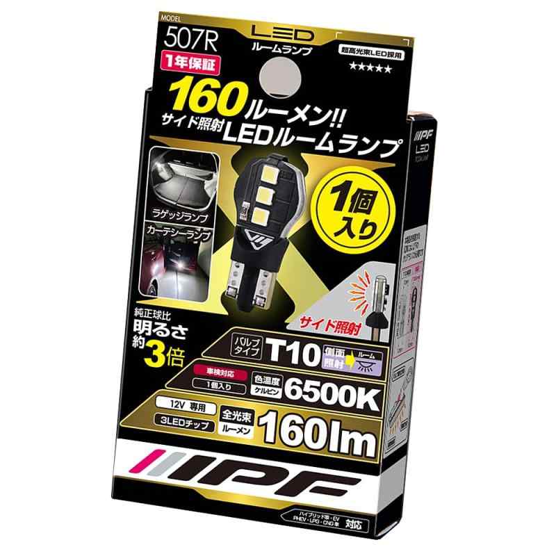 IPF ルームランプ LED 車用 T10 160lm 6500K ホワイト 12V用 1個入 ハイパワー サイド照射 ラゲッジ カーテシー バニティ 横挿しランプに最適 507R