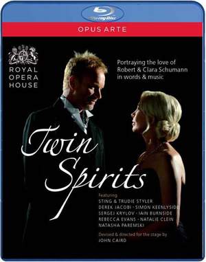 ドキュメンタリー・ドラマ「ツイン・スピリッツ」 〜歌と朗読で綴るロベルト&クララ・シューマンの愛の軌跡〜 ロベルト・シューマン役(語り):スティング ロベルト・シューマン役(歌):サイモン・キーンリーサイド クララ・ヴィーク役(語り):トルーディ・スタイラー クララ・ヴィーク役(歌):レベッカ・エヴァンス ナレーター:デレク・ジャコビ セルゲイ・クリーロフ(ヴァイオリン) イアイン・バーンサイド(ピアノ) ナタリー・クライン(チェロ) ナターシャ・パレムスキ(ピアノ) 原案・演出: ジョン・ケアード ・シューマン:謝肉祭 作品9より「前口上」 ・シューマン:子供の情景 作品15より「ねだる子供」、「鬼ごっこ」、「見知らぬ国と人々について」 ・ショパン:『ドン・ジョヴァンニ』の「お手をどうぞ」による変奏曲 作品2よりアダージョ ・シューマン:ケルナーの詩による12の歌曲 作品35より「ひそやかなる涙」 ・クララ・シューマン:「彼は来た、嵐と雨の中を」 作品12-2 ・シューマン:二重唱「彼と彼女」 作品78-2 ・クララ・シューマン:ピアノ協奏曲イ短調 作品7より第2楽章「ロマンス」 ・シューマン:3つのロマンス 作品94より第2番 ・シューマン:謝肉祭 作品9より「フィリシテ人と闘う『ダヴィッド同盟』行進曲」 ・モーツァルト:『ドン・ジョヴァンニ』K.527より 二重唱「お手をどうぞ」 ・シューマン:詩人の恋 作品48より「ばら、ゆり、鳩、太陽」、「君のひとみを見つめるとき」、「私は嘆くまい」 ・クララ・シューマン:「彼らはお互いに愛し合っていた」作品13-2 ・シューマン:詩人の恋 作品48より「夢の中で私は泣いた」 ・シューマン:ケルナーの詩による12の歌曲 作品35より「ひそやかな愛」 ・シューマン:子供の情景 作品15より「トロイメライ」 ・シューマン:ケルナーの詩による12の歌曲 作品35より「問い」 ・シューマン:ピアノ三重奏曲第1番ニ短調よりフィナーレ 収録:2007年12月、コヴェント・ガーデン王立歌劇場 日本語字幕無し