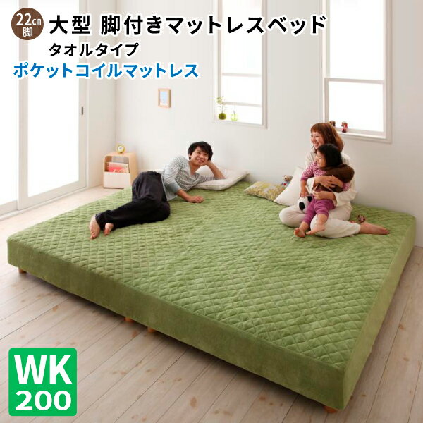 脚付きマットレス (脚22cm ワイドキング200 ポケットコイル タオルタイプセット) マットレスベッドとカバーセット 脚付きマットレスベッド 家族用大型サイズ キングベッド マット付き (エラムス) 送料無料
