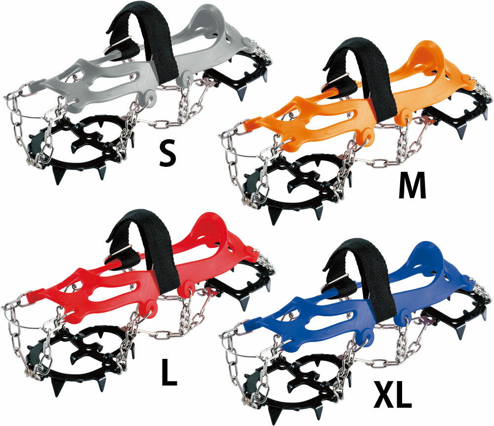 サイズ(EUR):S/36~38、M/39~41、L/42~44、LL/45~47 素材:シリコン・スチール シューズ対応:オールラウンド 重量(ペア平均重量):S/約455g、M/約478g、L/約495g、LL/約500g カラー:S/グレー、M/オレンジ、L/レッド、LL/ブルー ※登山用クランポンとしての代用には使用できません。比較的容易な冬山登山から夏山の雪渓歩きまで幅広く対応。アイスマスター Rは雪または氷による滑りの危険性があるときに、いつでも使用可能な丈夫で信頼性の高いチェーンスパイクです。 伸縮性のエラストマーバインディングシステムにより、すばやく簡単に着脱可能です。13個の15 スチールポイントは丈夫で安全にグリップします。鋼チェーンは強度と耐久性にも優れています。
