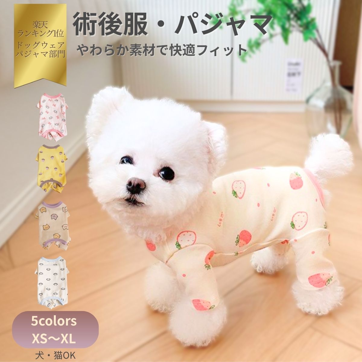 商品情報生産国中国サイズ画像にございますサイズは目安になります。また布製品につき製品ごとの誤差(1〜3cm程度)はございます。こちらの洋服は伸縮性はございますが、ペットの体型には個体差がございますので、すべてのペットのサイズの合致をお約束しているものではございませんので、予めご了承をお願い致します。注意事項ご覧いただいております環境により色は、実際の商品の色と異なって見える場合がございます。あらかじめご了承ください。術後服はすべての手術部位がカバーできるものではなく、部位よってはエリザベルカラーの方が適している場合もございます。写真などをご参考の上、術後服としてご購入の場合は手術部位などをお考えの上ご購入をお願い致します。当商品は輸入品につきパッケージが海外仕様の場合がございます。リーズナブルにご提供させていただくため、輸入時のパッケージのままお届けをさせていただいております。予めご了承ください。術後服 犬 猫 パジャマ ロンパース 長袖 XS S M L XL かわいい柄 いちご どんぐり スマイル ネコ 春夏秋冬 オールシーズン 快適素材 犬猫兼用 部屋着 ルームウェア ペット服 送料無料 イエロー ピンク 術後のケアに使いやすいやわらか長袖パジャマ。いちご・どんぐり・スマイル・ネコの可愛い柄でお部屋時間も快適。犬猫兼用ロンパース。XS〜XL対応。 ?商品説明やわらかい素材で、術後のデリケートな体もやさしく包む長袖パジャマ。いちご・どんぐり・スマイル・ネコの4柄から選べる可愛いロンパースタイプで、お部屋でのリラックスタイムや軽い術後ケアにぴったりです。縫い目が肌に当たりにくく、動きやすい伸び感でストレスを軽減。締め付けが少ないデザインなので、敏感な時期のワンちゃん・ネコちゃんも快適に過ごせます。XS〜XLの豊富なサイズ展開で、犬猫どちらにもフィットしやすい形に仕立てました。部屋着、抜け毛対策、軽度のカバー用パジャマとしてオールシーズン活躍します。?ポイント術後ケアにも使いやすいやわらか素材いちご/どんぐり/スマイル/ネコから選べる可愛い柄犬猫兼用:XS〜XLの豊富なサイズ展開動きやすいロンパースタイプ部屋着・リラックスウェアとしても便利春夏秋冬オールシーズン対応締め付けの少ないやさしいフィット感?サイズ感と着用シーンお家でゆっくり過ごす時の“パジャマ”として術後の軽いカバーに抜け毛対策やお部屋の汚れ防止に写真映えする可愛いデザインでお散歩や通院にも◎?注意事項手術部位の場所や症状によっては、エリザベスカラーの併用が適している場合がございます。生地はやわらかいパジャマ素材のため、本格的な術後固定ウェアとは用途が異なります。着用中はペットの様子を確認してください。サイズは目安のため、体型によりフィット感が異なる場合があります。※商品の色味は、ご覧いただくモニターや室内の明るさにより実際と多少異なって見える場合があります。できるだけ実物に近い色で掲載しておりますが、印象の差についてはご理解ください。 2