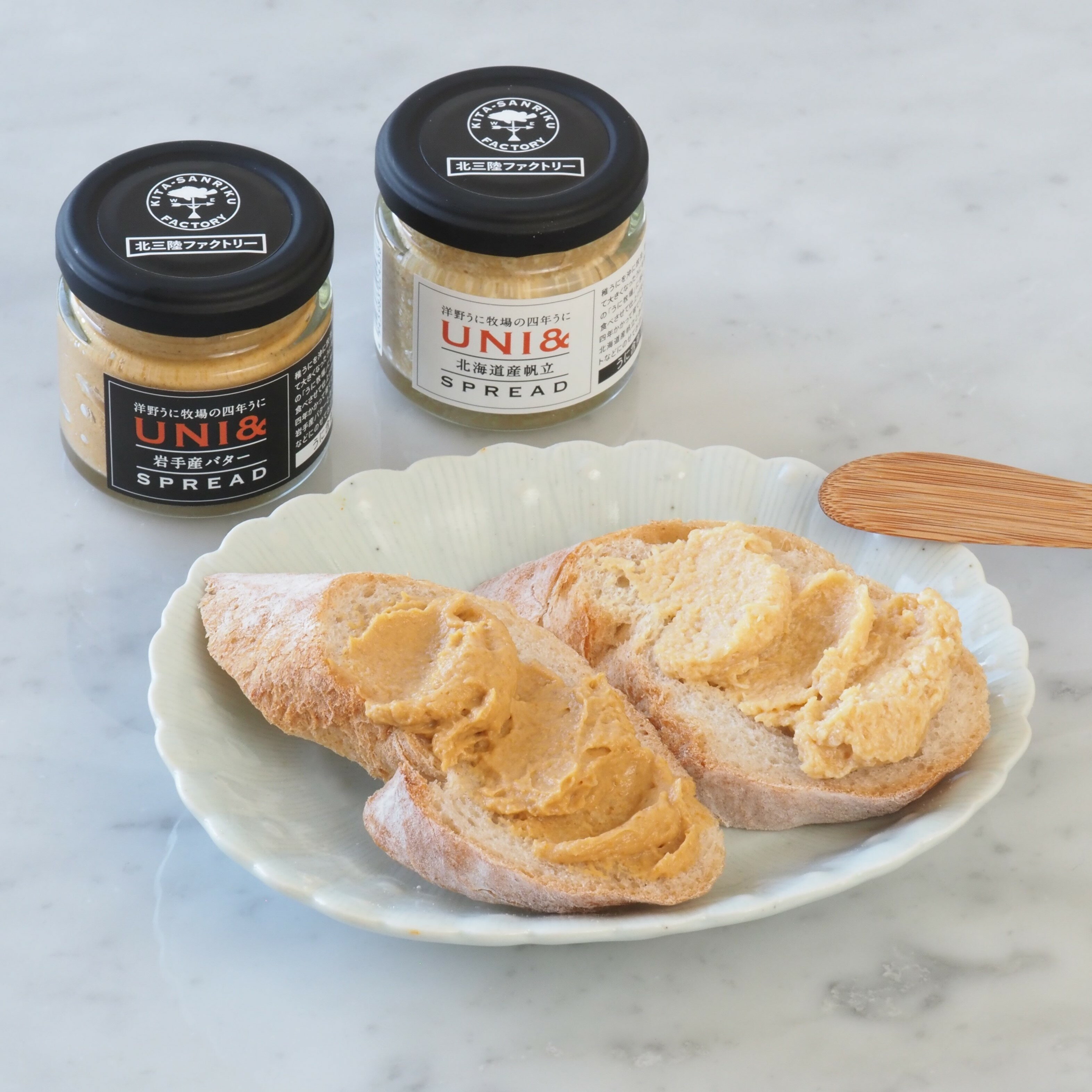 令和元年度復興シーフードショーIWATEの一環として実施された、第21回岩手県水産加工品コンクールにおいて、UNI&岩手産バター SPREADが最高賞の「 農林水産大臣賞」を受賞しました。四年かけて育てた洋野町産のキタムラサキウニを、水揚げ後すぐに丁寧に蒸し上げ、良質の生乳からつくられる岩手産バターと合わせた贅沢なスプレッドです。ウニのおいしさを良質なバターでさらに際立たせました。口当たりがまろやかで、ウニ含有量は70%と濃厚です。そのままバゲットやクラッカーでお召し上がりください。牛肉の赤身ステーキなどにのせて、ワインと合わせるのもおすすめです。 UNI&帆立 SPREAD…四年かけて育てた洋野町産のキタムラサキウニを水揚げ後すぐに丁寧に蒸し上げ、甘みの濃いホタテと合わせたスプレッドです。バゲットやクラッカーにのせてお召し上がりください。 商品説明 名称 洋野うに牧場の四年うに/UNI&岩手産バター SPREAD・UNI&帆立 SPREAD 各1個 内容量 UNI&岩手産バターSPREAD、UNI&帆立SPREAD(瓶入り) 60g×各1 原材料 うに、ほたて、バター、みりん、醤油、塩 保存方法 冷凍 賞味期限 冷凍90日(解凍後4日以内) アレルギー 原材料の一部に乳成分、大豆を含む 事業者 株式会社北三陸ファクトリー ・ふるさと納税よくある質問はこちら ・寄付申込みのキャンセル、返礼品の変更・返品はできません。あらかじめご了承ください。「ふるさと納税」寄付金は、下記の事業を推進する資金として活用してまいります。 寄付を希望される皆さまの想いでお選びください。 (1) 福祉関係 (2) 教育振興関係 (3) ふるさと創生関係 (4) 農林水産振興関係 (5) ゼロカーボン推進関係 (6) 洋野町に一任 特徴のご希望がなければ、町政全般に活用いたします。 入金確認後、注文内容確認画面の【注文者情報】に記載の住所にお送りいたします。 発送の時期は、寄附確認後20日以内を目途に、お礼の特産品とは別にお送りいたします。