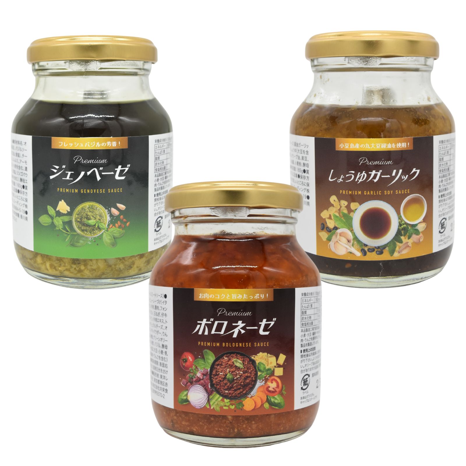 【11/20(20時〜)★最大2000円OFFクーポン】Premiumソース3種セット ジェノベーゼ ボロネーゼ しょうゆガーリック 各1個 オリーブオイル ガーリック グルテンフリー ダイエット 食品 パスタソース スパゲティ 小麦不使用 化学調味料無添加 糖質オフ