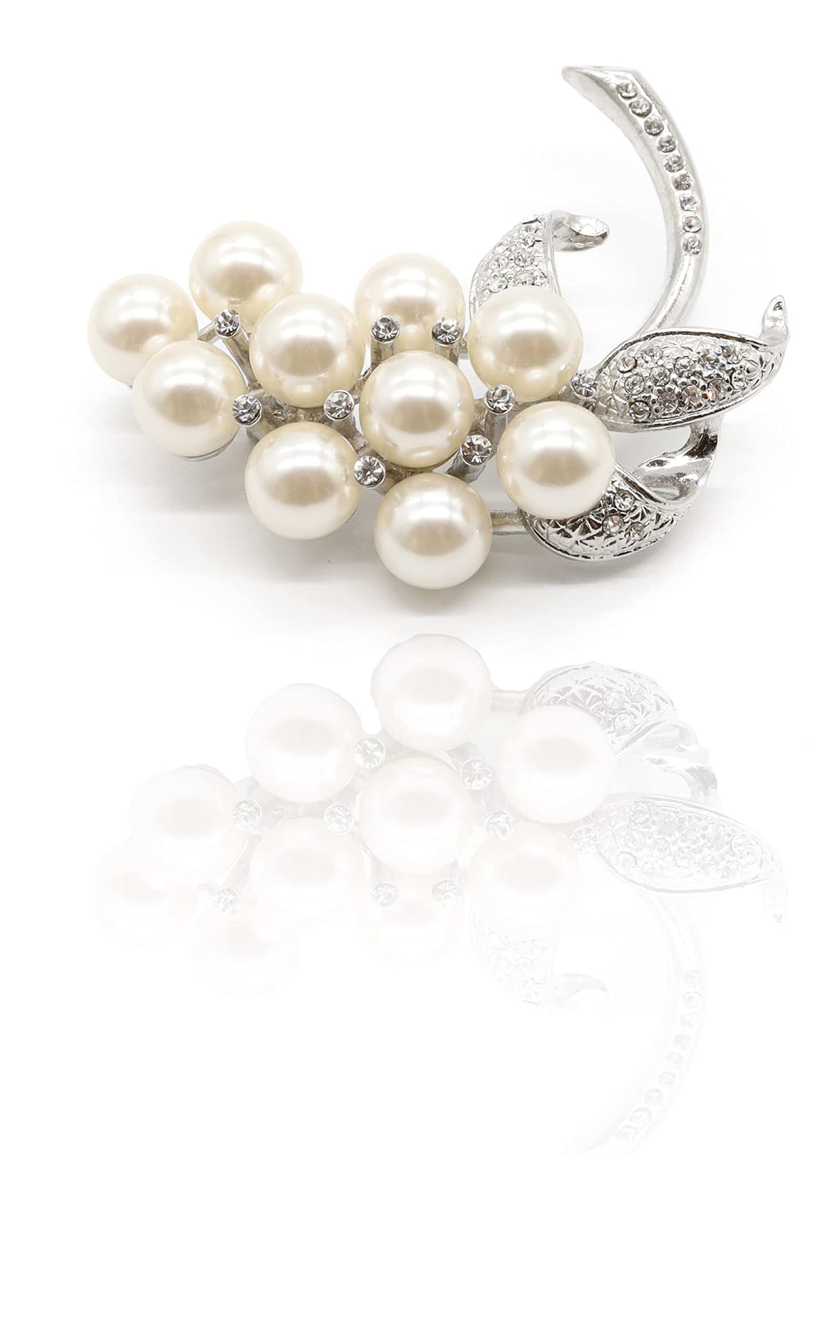 セレモニー、フォーマルシーンに映えるパールとカットガラスのブローチセレモニーシーンでは七五三、お宮参り、入学・入園、卒業・卒園などの式典におすすめです。フォーマルシーンでは結婚式のお呼ばれなどに。シルバーのアクセサリーは派手すぎず上品な印象を与えてくれるので、親族や母親としての立場での参列におすすめのアクセサリーです。シンプルなネイビーセットアップやスーツ、ブラックフォーマルなどにコサージュの代わりにつけると、上品で洗礼された印象を与えてくれます。ブローチは元々は装身具。ストールなどの留め具としてや、バックチャームに使ったりと、カジュアルシーンにも活躍します。 大小7粒のパールが円を描いたブローチ。パールを取り巻くカットガラスが上品に彩ります。 ネイビーのシンプルなワンピースにコーディネートすると一気に華やかに変身! 一年を通して大活躍なパール。 コサージュでは大げさすぎるけどちょっと胸元が寂しいかな…、というときにはとても重宝するアイテムです。 ブライダルシーンではパールネックレスやシルバーネックレスなど、合わせるネックレスを問わないので、おしゃれな装いとなります。 もちろん結婚式だけでなく、七五三・お宮参り・入園入学・卒業卒園などのイベントごとから、オンラインセミナーやレセプションなどの会社行事でも上品な雰囲気を作り出します オンラインでのセミナーや打ち合わせなど非対面でのビジネスが増える中、おしゃれかわいいブローチで少し華やかさをプラスしてみてはいかがでしょうか。 十分な存在感でお値段以上に高見えするのでフォーマルなお席やプレゼントにも喜ばれます。