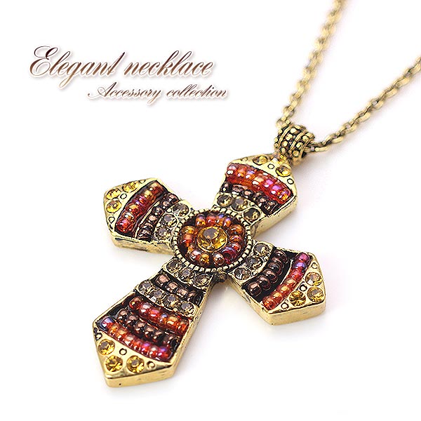 キラキラ クロス ネックレス エスニック ゴールド ビーズ 十字架 メール便送料無料 華やか ペンダント アクセサリー ロザリオ プレゼント ギフト 贈り物 誕生日 記念日 輝く きらきら クール かっこいい 首飾り ユニセックス [ 20代 30代 40代 ]